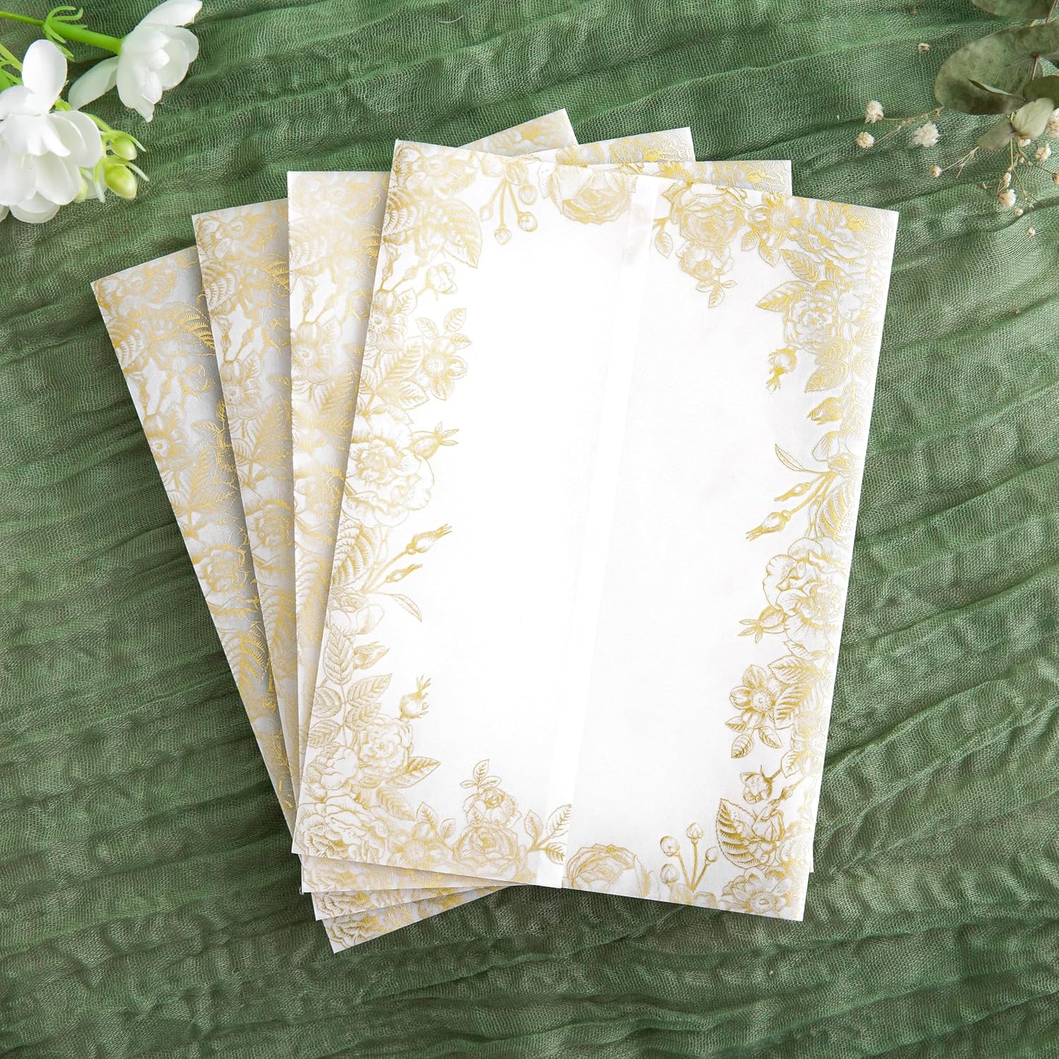 PONATIA 50 PCS Vellum Jackets for 5x7 Invitations- 135gsm Gold Foil Print Floral Printed Vellum Sleeves, Quinceanera Wedding Invitation Cards Wraps, Transparent Christmas Gift Cards Jackets