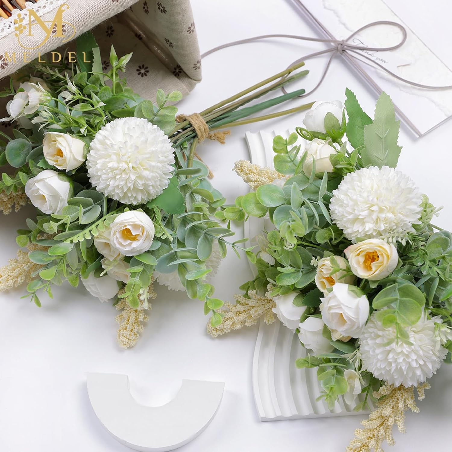 Meldel 3Pcs Rose Bouquet White&Champagne Artificial Flowers Eucalyptus Plants Silk Flower Arrangements Wedding Bouquets Decorations Plastic Floral Centerpieces for Home Kitchen Garden Party Decor