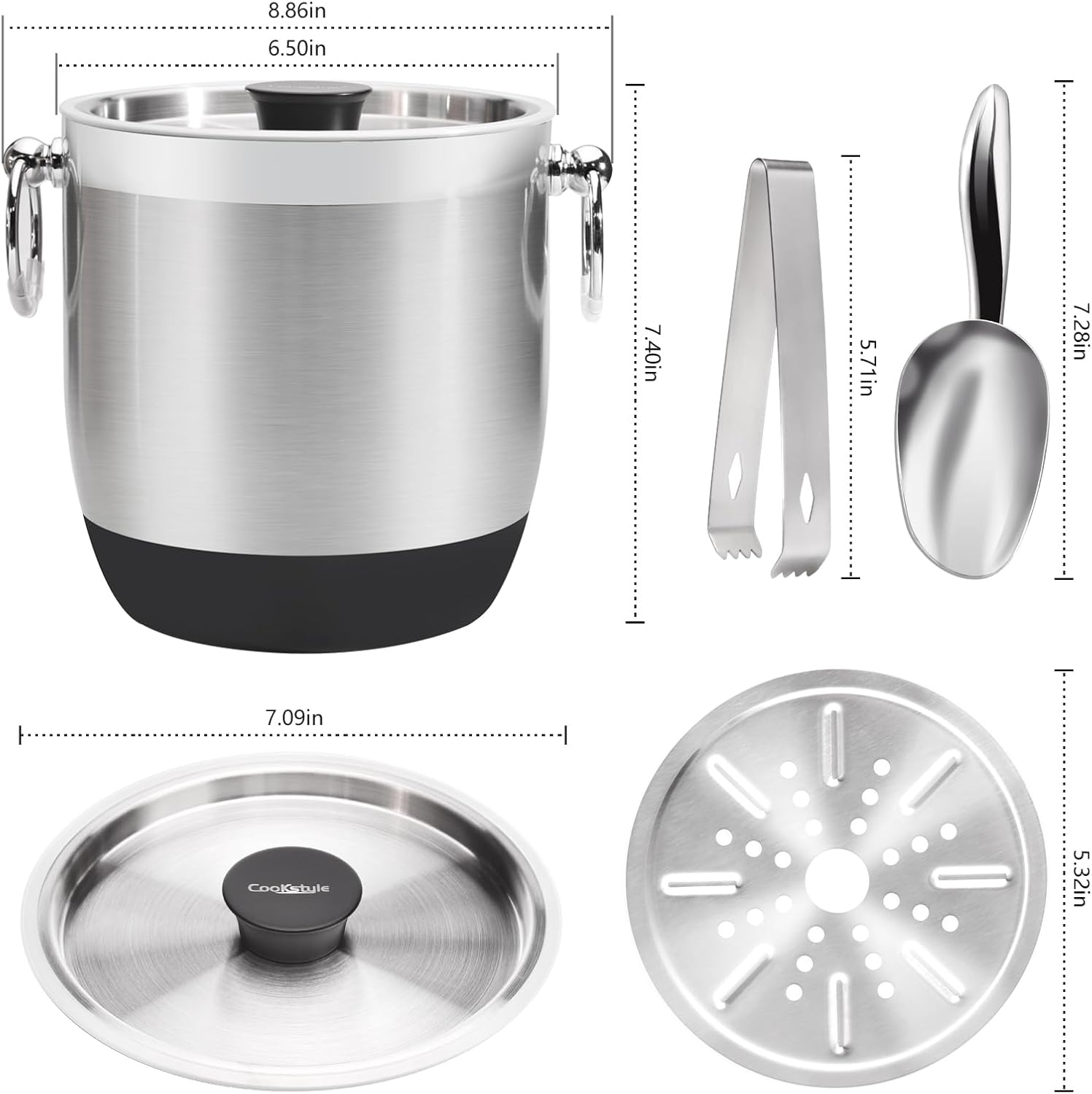 - 【COMPLETE ICE BUCKET SET】COOKSTYLE ice buckets containers come with every accessory needed: lid, scoop, tong and strainer. The lid has a sealing ring and hook, making it easy to use.