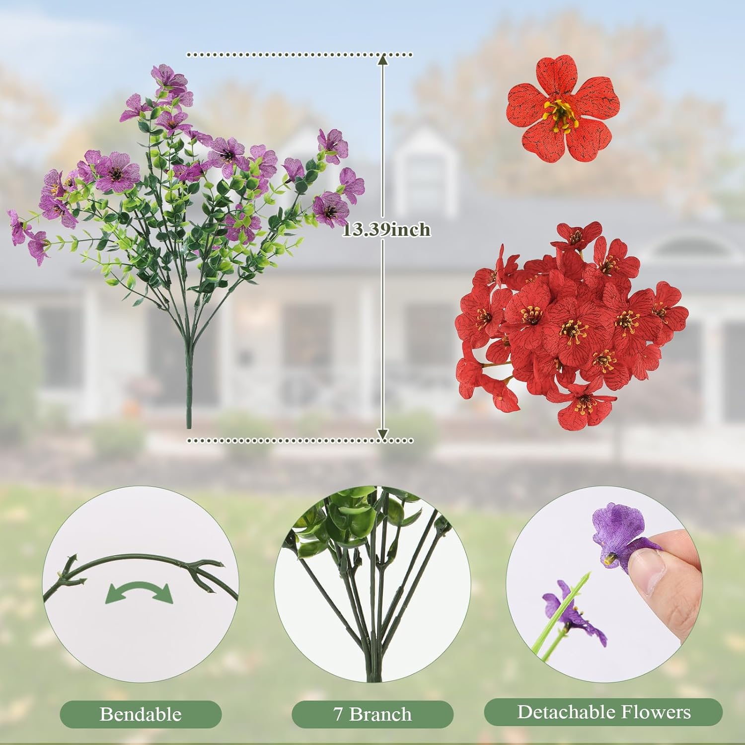 - Realistic Faux Flower Bouquets: The colorful fake flowers with realistic textures and flexible stems are very close to real flowers. Ideal decoration for garden, front doors, window, pots, etc.