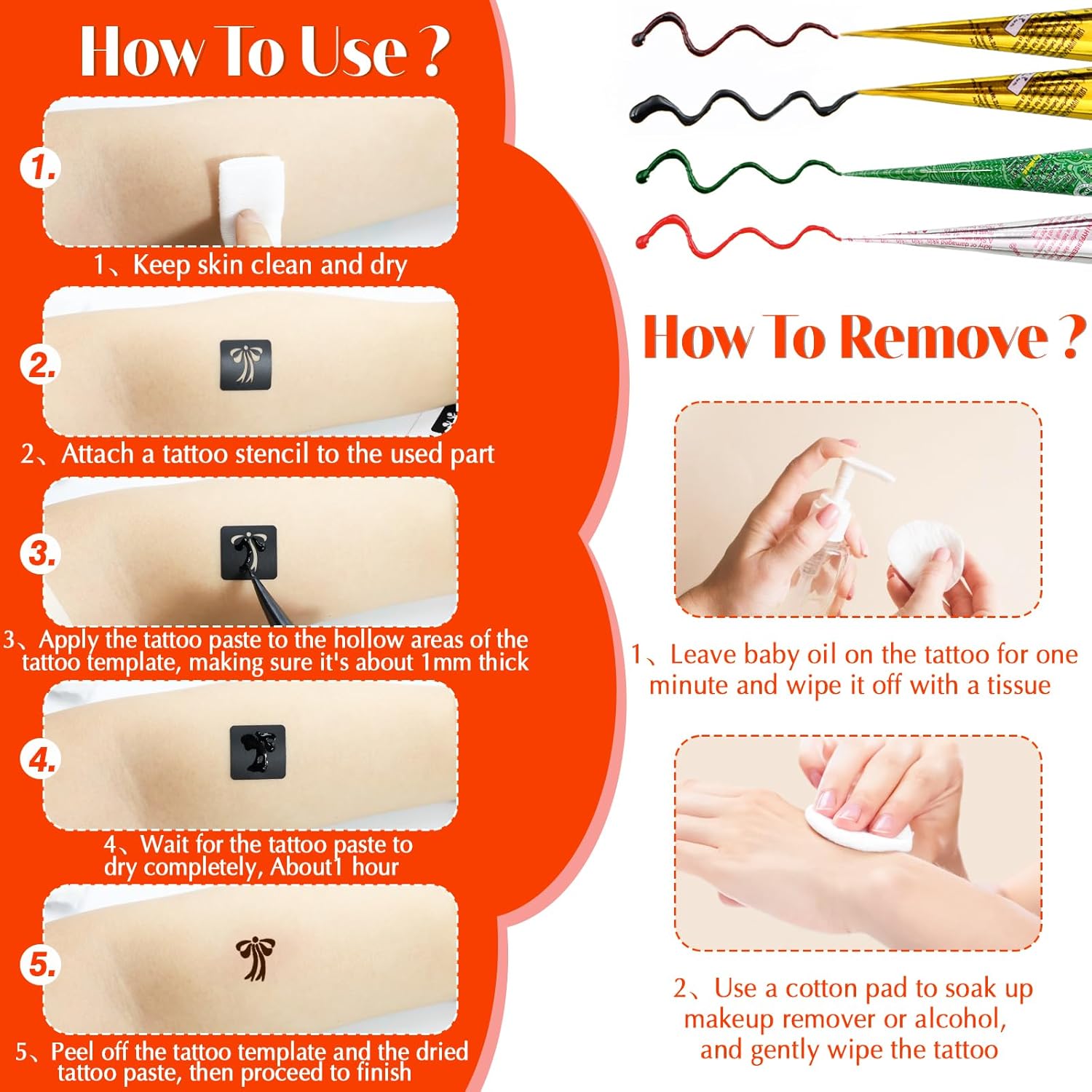 - RICH TEMPORARY TATTOO KIT - Contains rich tattoos pattern templates (102 designs),8 tattoo inks in 4 colors (Brown,Black,Cherry red,Green),4 disposable gloves 1 pack of cleaning supplies,allowing you to easily create unique personalized tattoos