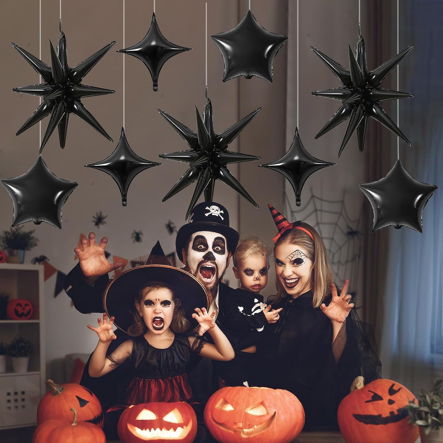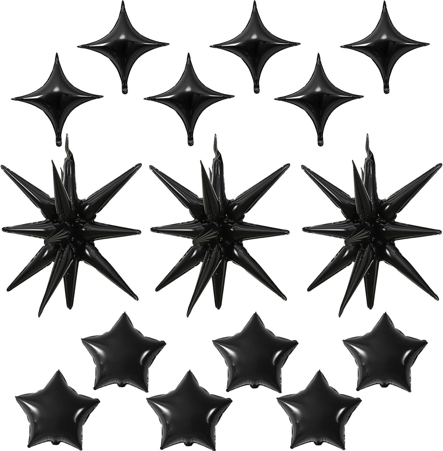 • Black Star Balloons Set: Package includes: Black aluminum foil star balloons (explosion stars Γ— 3, four-pointed stars Γ— 6, five-pointed stars Γ— 6) , a straw and ribbon