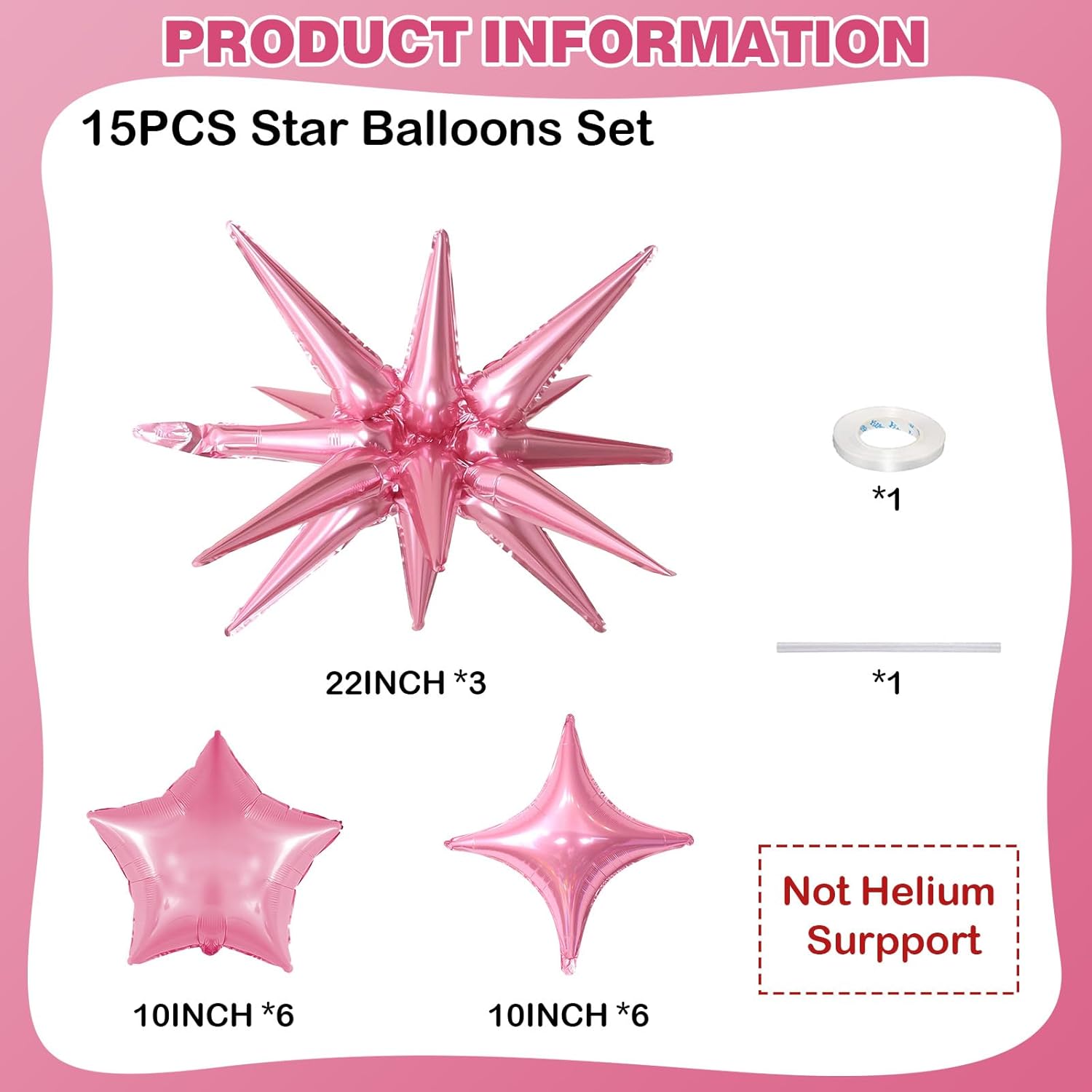 - Pink Star Balloons Set: Package includes: Pink aluminum foil star balloons (explosion stars Γ 3, four-pointed stars Γ 6, five-pointed stars Γ 6) , a straw and ribbon