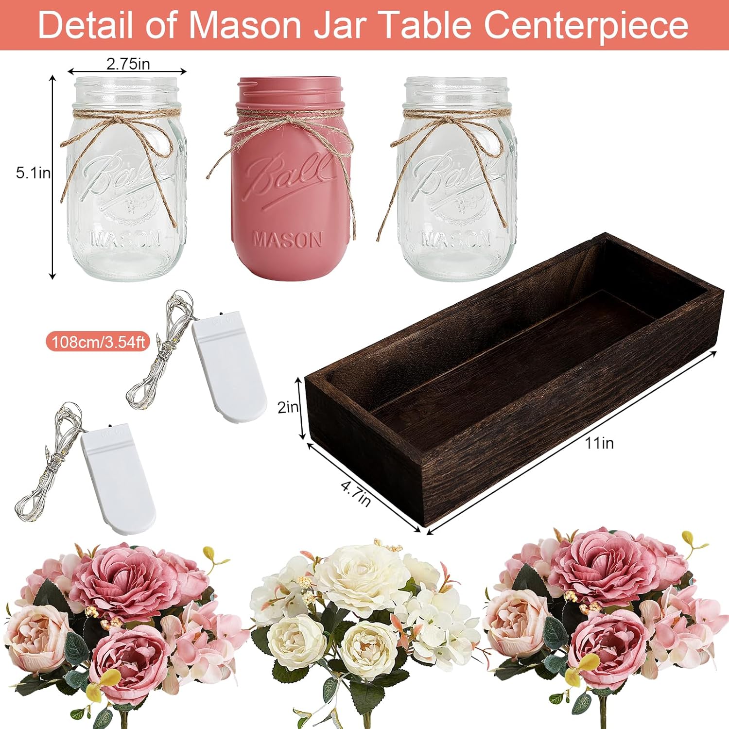 - Elegant Table Centerpiece Set: This rustic mason jar table centerpiece for dining room includes 1 wood tray, 3 glass jars, 3 faux peony flowers, and 2 LED fairy lights (batteries included), adding a unique charm to your dining table, coffee table, or kitchen.