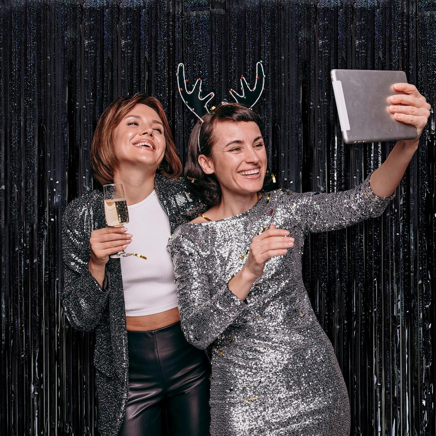 - Party Decorations:Black fringe backdrop– perfect for photo backdrops, parties or glow events! This black tinsel curtain party decorations reflects dazzling colors under light. Easily hangs on walls or windows, pairs perfectly with LEDs and balloons.