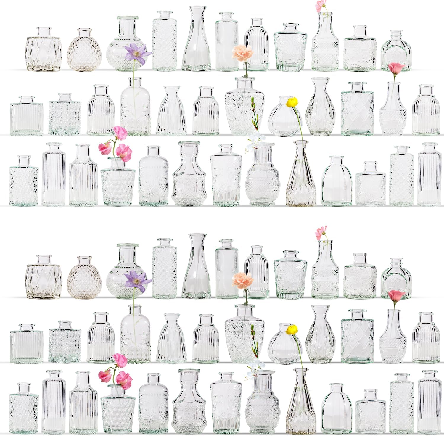 - VERSATILE DESIGN: Each small clear vase has a beautiful embossed pattern,suitable for all seasons, various sizes and shapes, smooth lines,you can mix and match flowers with elegant vases as you like, velvet flowers and dried flowers are also good choices.