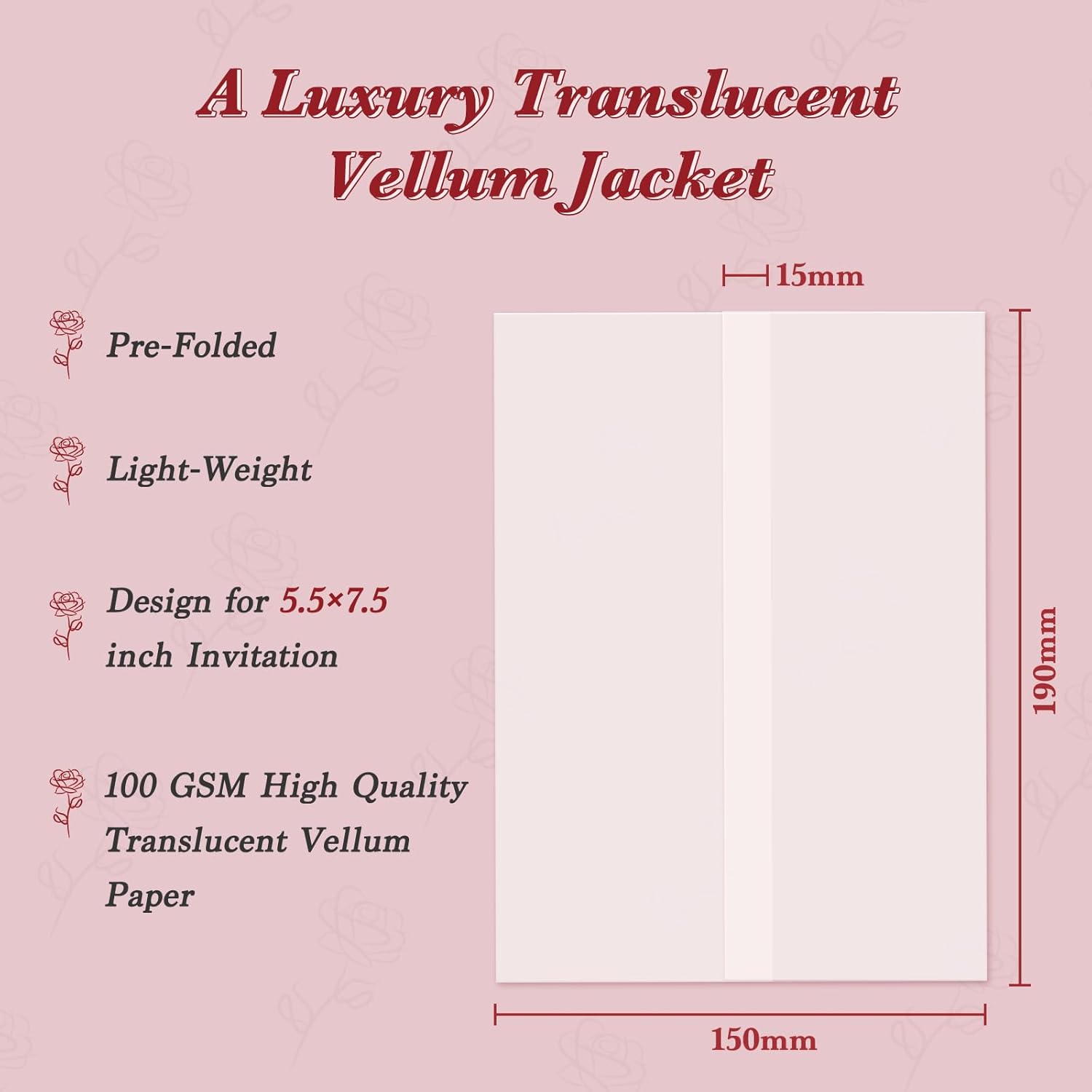 - VERSATILE: Add your wedding invitations to these stylish vellum jackets to impress your friends, family and colleagues before they arrive at your wedding,baby welcome parties, birthday parties, wedding receptions and other formal events.