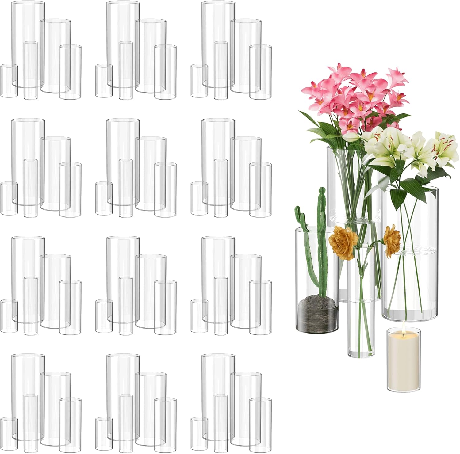 - 5-Size Cylinder Vase Set for Versatility From minimalist single stems (2.1×3.9 inchs) to lavish bouquets (3.7×9.8 inchs), 60 premium Cylinder vases in 5 sizes fit orchids, roses, or succulents.