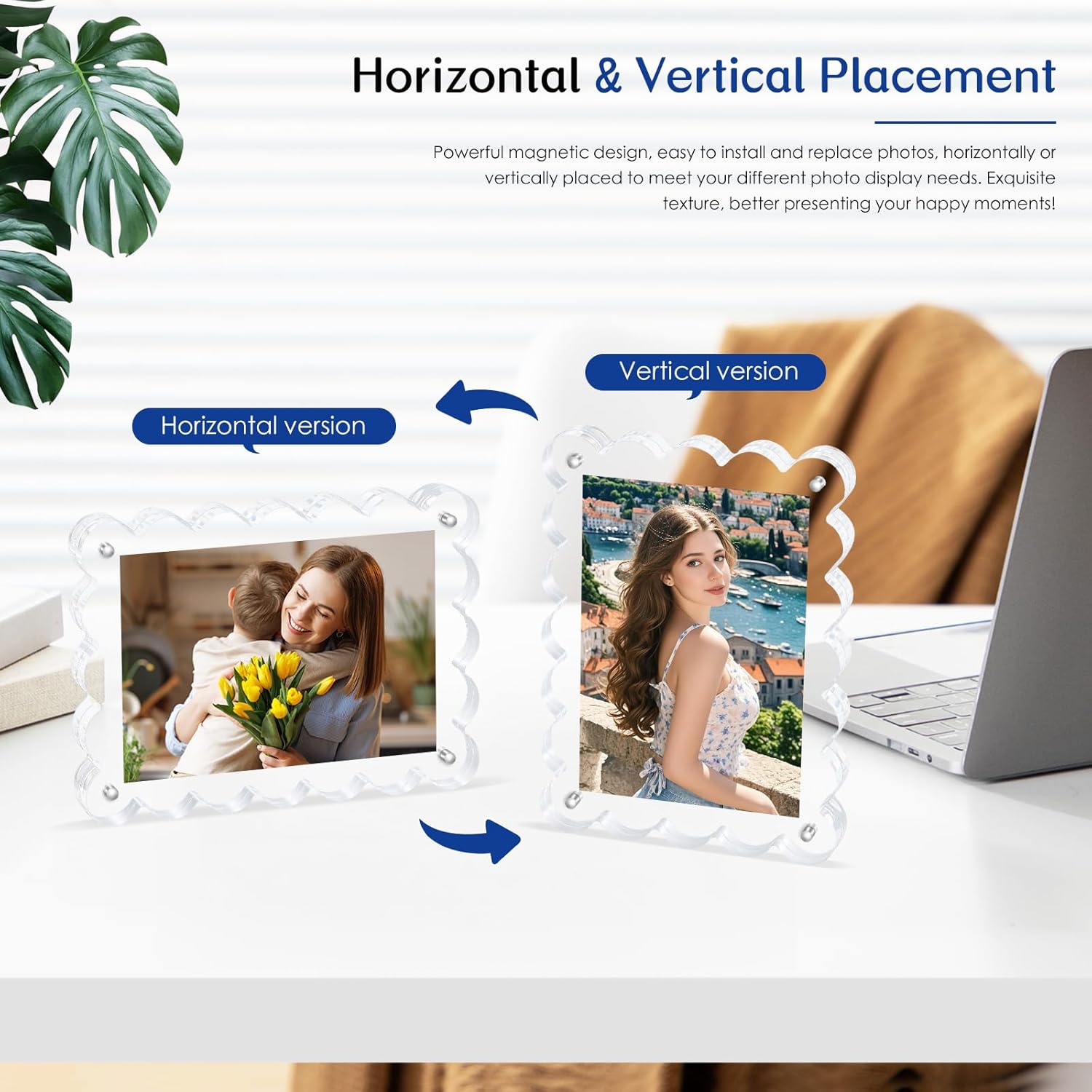 - 【Versatile 4x6 Acrylic Frames for Multi-Directional Displays】 Display photos horizontally or vertically with these 4x6 magnetic frames. Their slim, double-sided design allows for single or dual-view setups, perfect for desks, shelves, or walls in homes, offices, or events