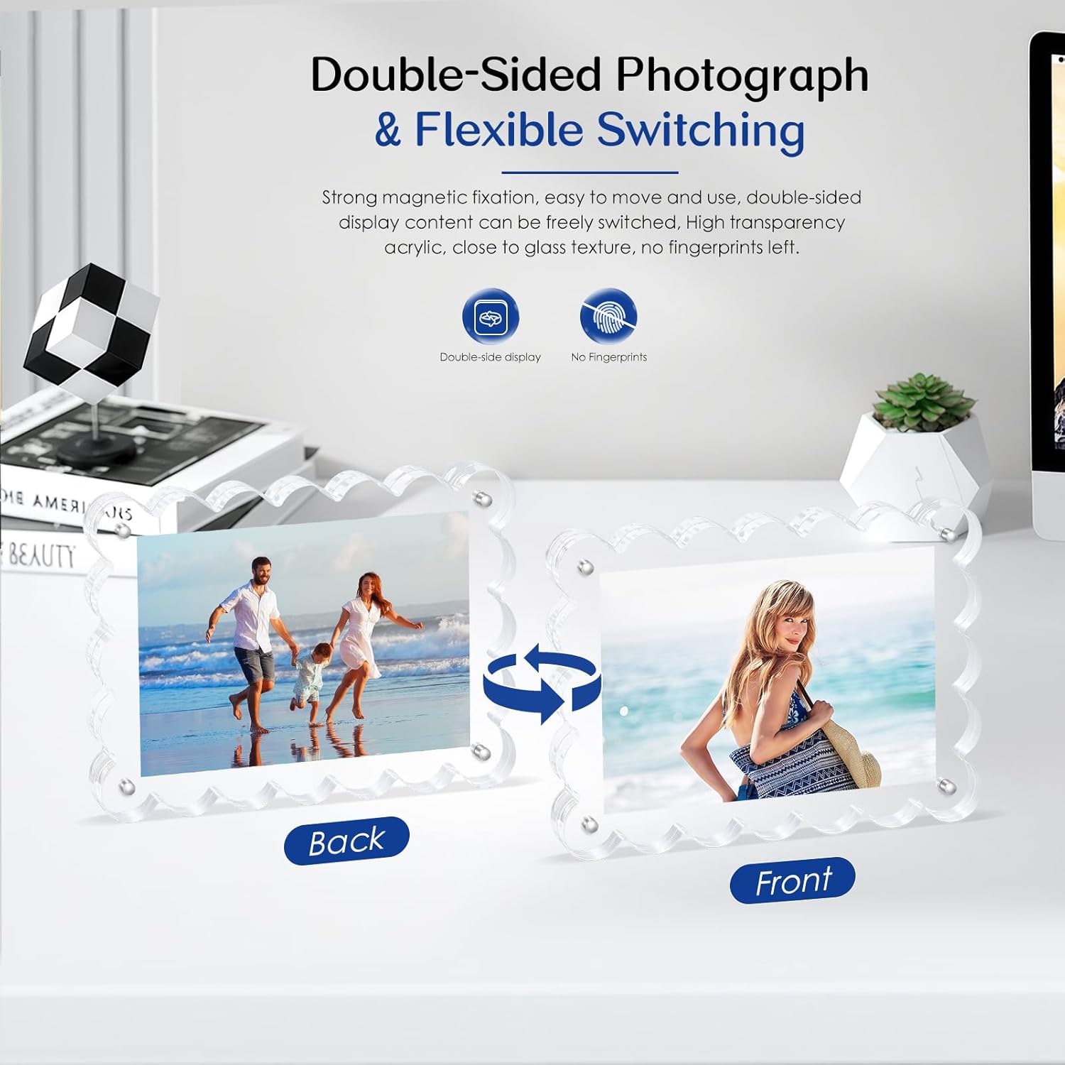Scalloped Magnetic Picture Frame 4x6 Inch - 6Pack Clear Acrylic Photo Frame, 20mm Thick Double-Sided Magnet Design, Trendy Desktop Display for Home/Office Decor (6 Pack, 4X6)