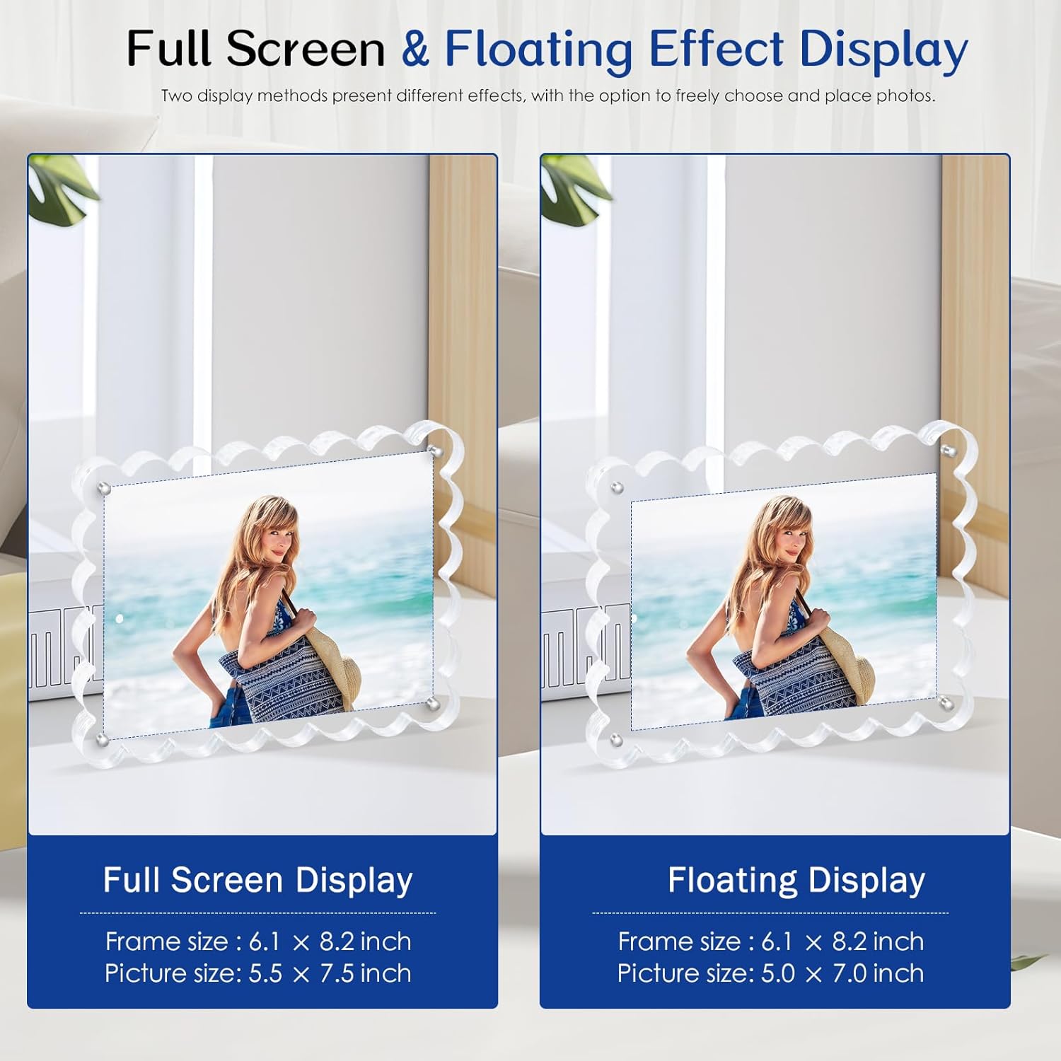 - 【Versatile 5x7 Display for Dynamic Arrangements】 Display 5x7 /7×5 photos, diplomas, or artwork vertically on desks or horizontally on shelves. Scalloped edges add dimensional flair to acrylic photo frames, adapting seamlessly to any décor style