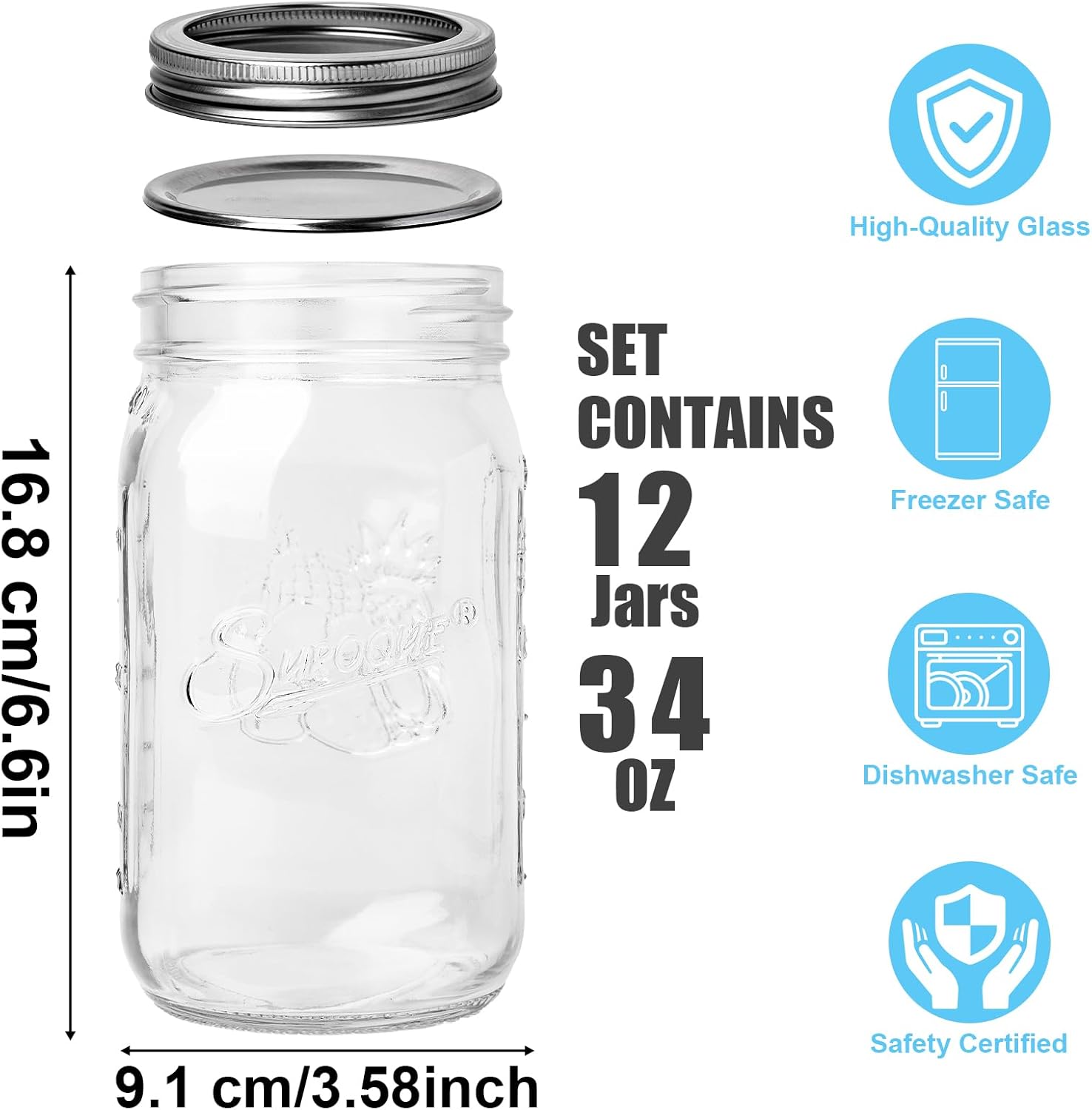 Mason Jars 32 oz Glass Canning Jars 12 Pack Wide Mouth Mason Jar With Airtight Lids