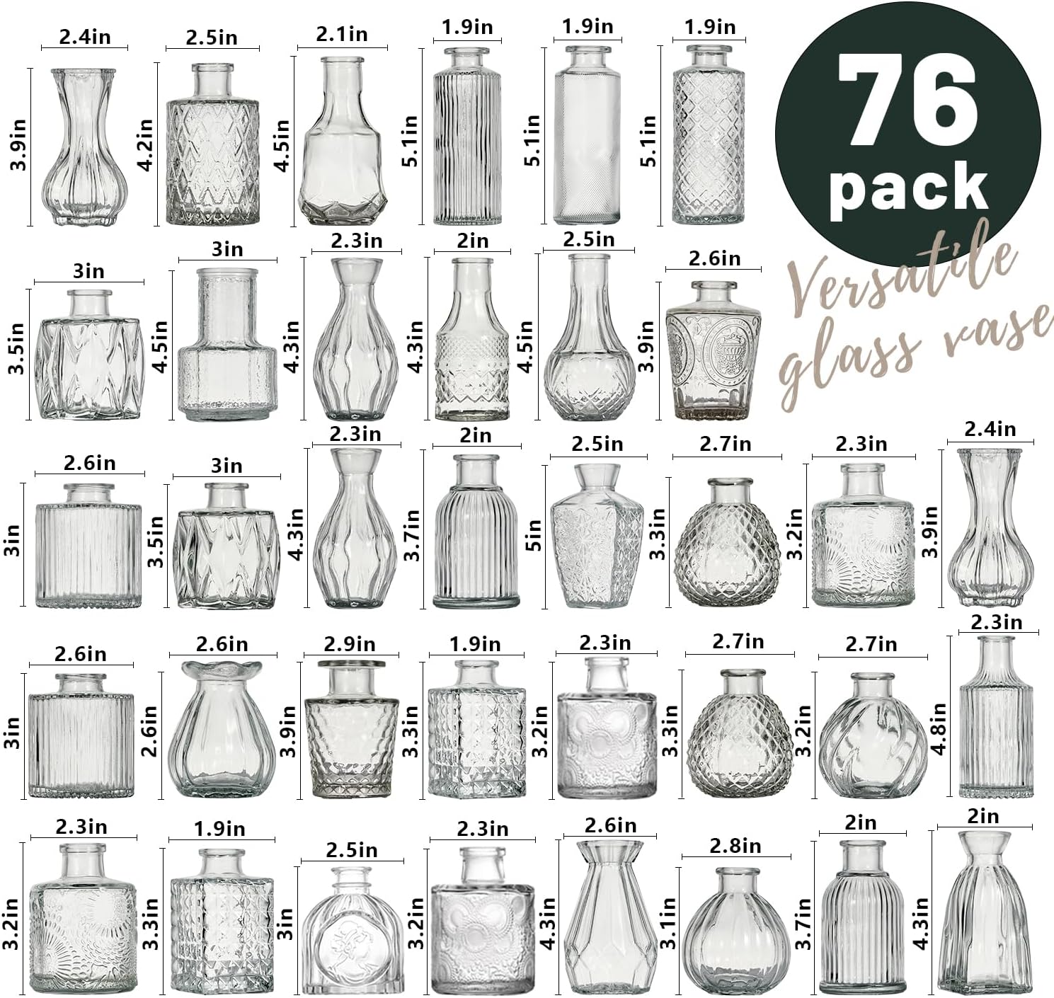 - Versatile Flower Bud Vase Set: This set comprises 76 diverse transparent glass flower bud vases, each adorned with etched designs to further elevate their charm. It is perfectly suited for any home décor. Whether placed as a centerpiece on dining tables, window sills, or wedding banquet tables, these small vintage crystal vases will lend an air of elegance to the setting.