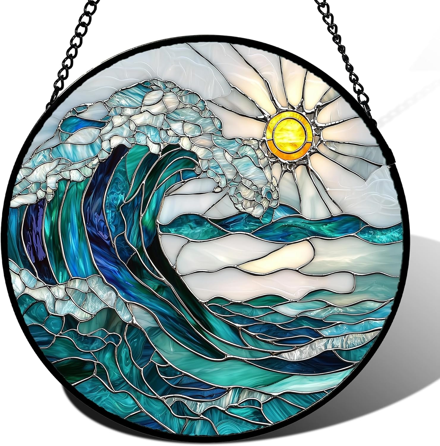 Stained Glass Window Hanging - Blue Green Waves Suncatcher for Door Terrace Garden Home Decor Sunrise Over The Sea Sun Catcher Birthday Gifts for Lovers Women Men Dad Mom Nana 6.3 in