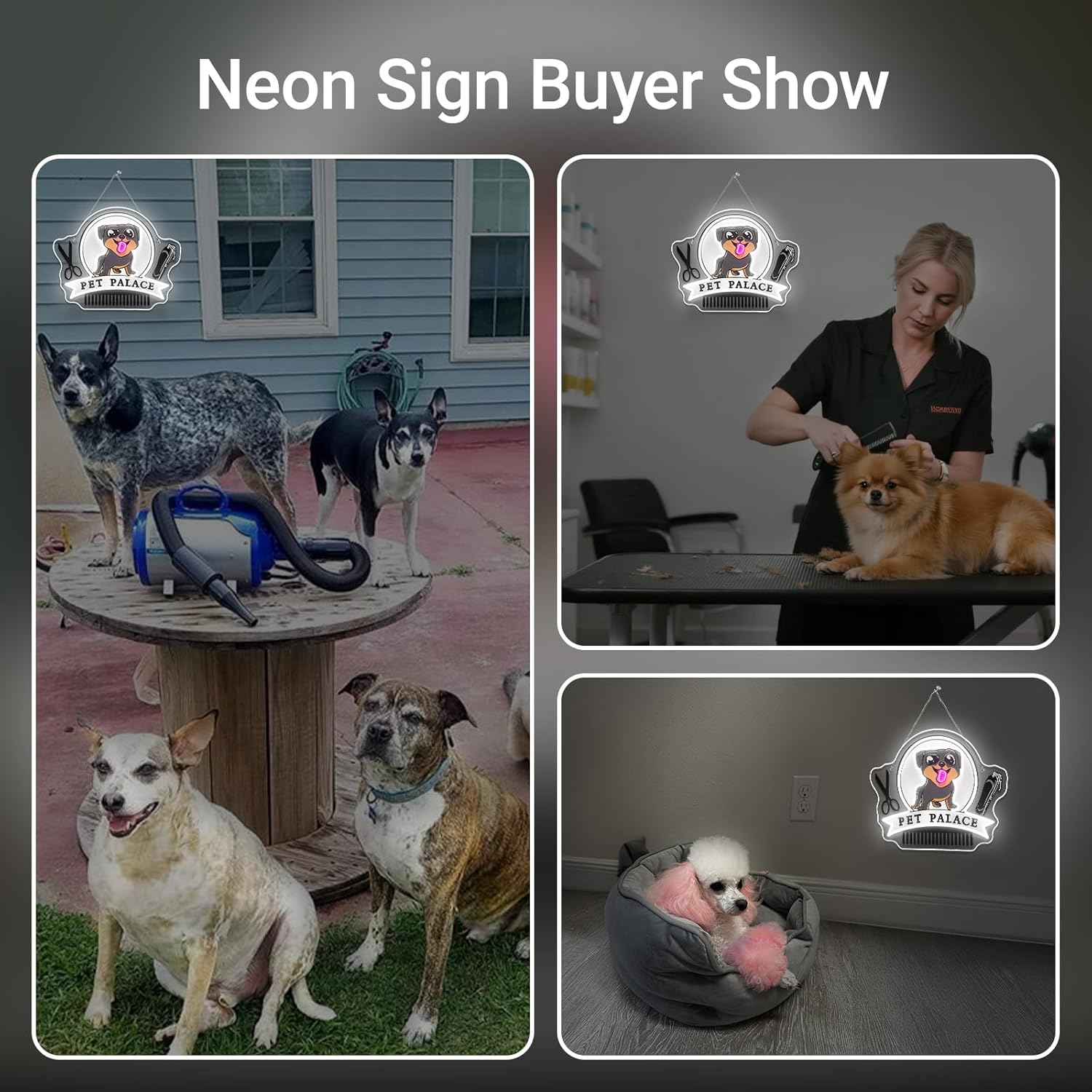 - Special & Pet-Friendly Design: The Pet Palace neon light (15.8*12.6in/40*32cm)will inject positive energy into your space decor. The playful multi-colored design features an adorable puppy surrounded by grooming tools,creating a playful and energetic salon atmosphere.