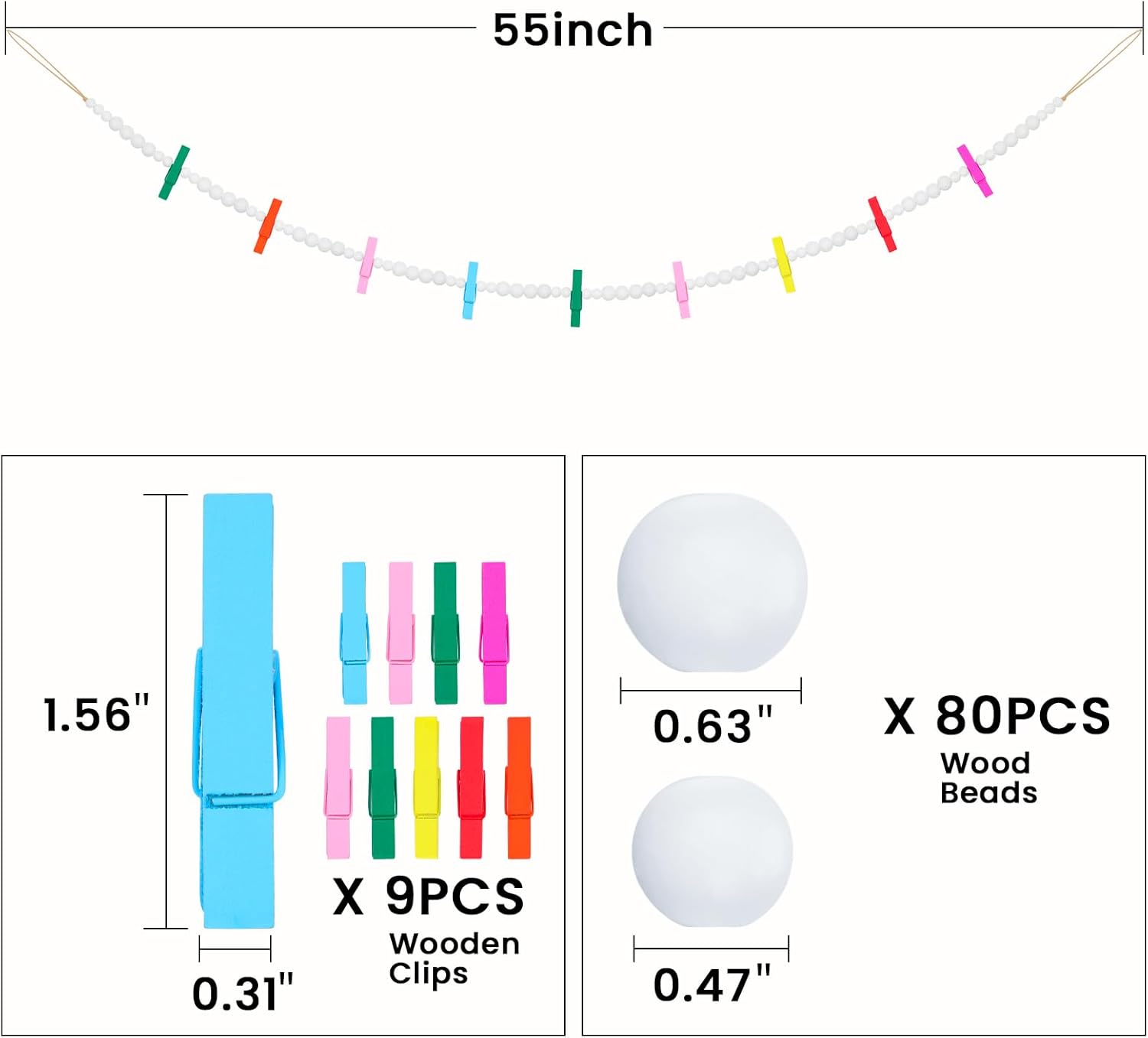 - Product Size: The total length of wood bead garland is 55", the wooden beads in 2 sizes, the diameter of beads is 0.47", 0.63". It is long enough to fit any home decor and add bohemian, farmhouse or fashion sense to bedroom, living room, dorms, offices and more