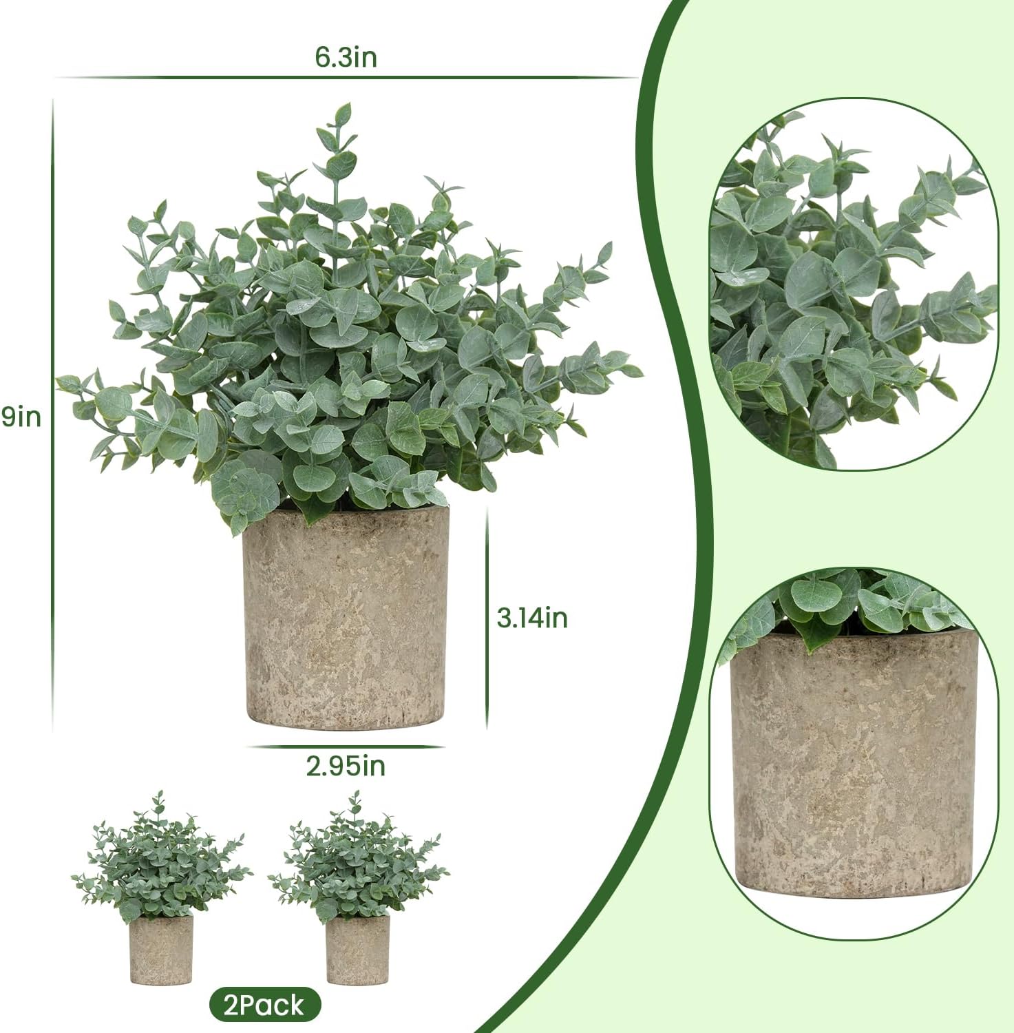 - Small Size & Adjustable Shape: This set includes 2 small artificial eucalyptus plants, each measuring approximately 9 inches in total height (from the top of the plant to the bottom of the pot) and 6.3 inches in width when the leaves are fully spread. The gray paper pulp pots are about 2.95 inches wide and 3.1 inches tall. You can gently adjust the leaves to achieve your desired shape and fullness. NOTE: The leaves may be slightly compressed during shipping β simply reshape them by hand to restore their natural appearance