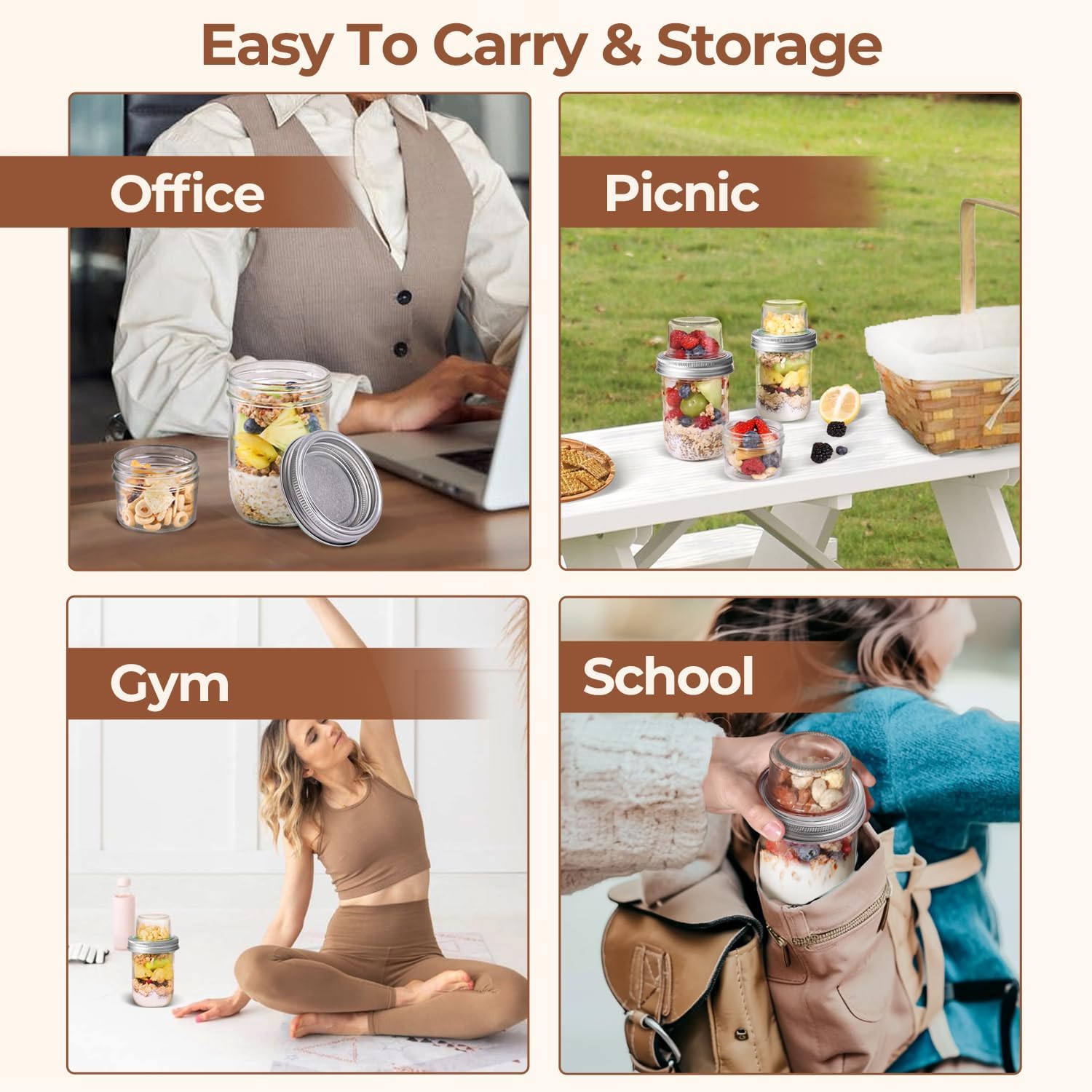 - Excellent Airtight Seal: Our glass overnight oats containers with lids feature custom lids and silicone rings for an airtight seal. They keep your food fresh and allow you to safely carry them in your bag during commutes without the worry of spills