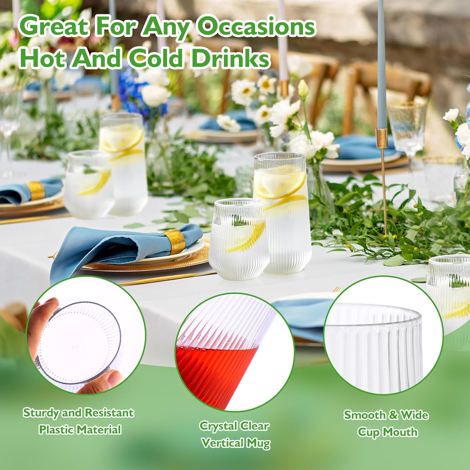 mwellewm 48 Pcs Plastic Wine Glasses Disposable Ribbed Cocktail Cups Set 9 OZ Stemless Champagne Flutes 12 OZ Origami Shatterproof Reusable Clear Party Cup for Wedding Home Office Bar Drinking