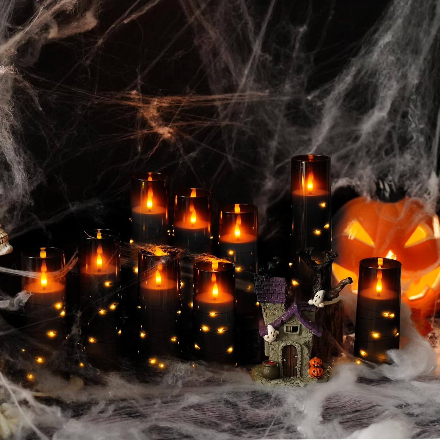 Flameless LED Candles with Timer 9 Pc Flickering Flameless Candles for Romantic Ambiance and Home Decoration Stable Acrylic Shell,with Embedded Star String,Battery Operated Candles(Black)