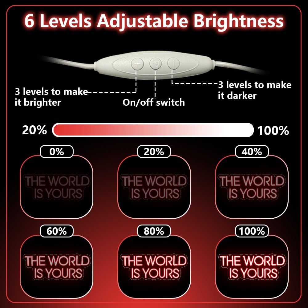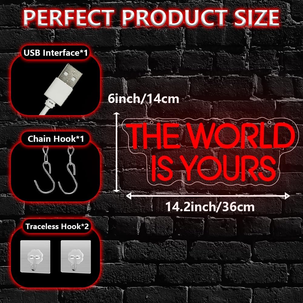 - 【Unique Design】This eye-catching neon sign features the empowering phrase "The World is Yours" brought to life in a vibrant,head-turning red glow.The rich,intense hue of red exudes confidence,passion,and unapologetic drive,making a powerful statement that demands attention and ignites motivation.