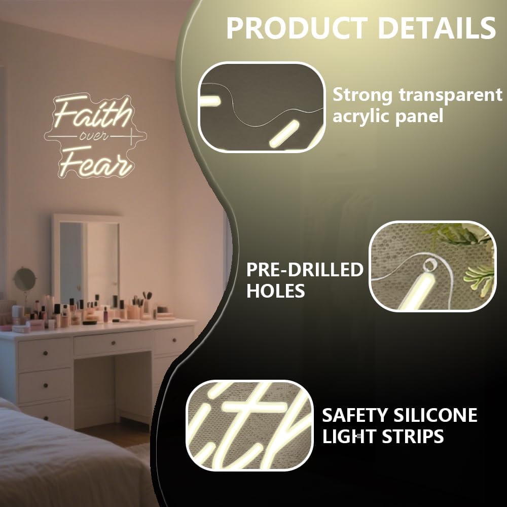 - 【Unique Design】This "Faith Over Fear" neon sign cast its warm glow,reminding you that belief is always brighter than doubt.At the core of this design is the powerful phrase "Faith Over Fear," where each word is illuminated in a soft,radiant yellow light,exuding warmth and reassurance.