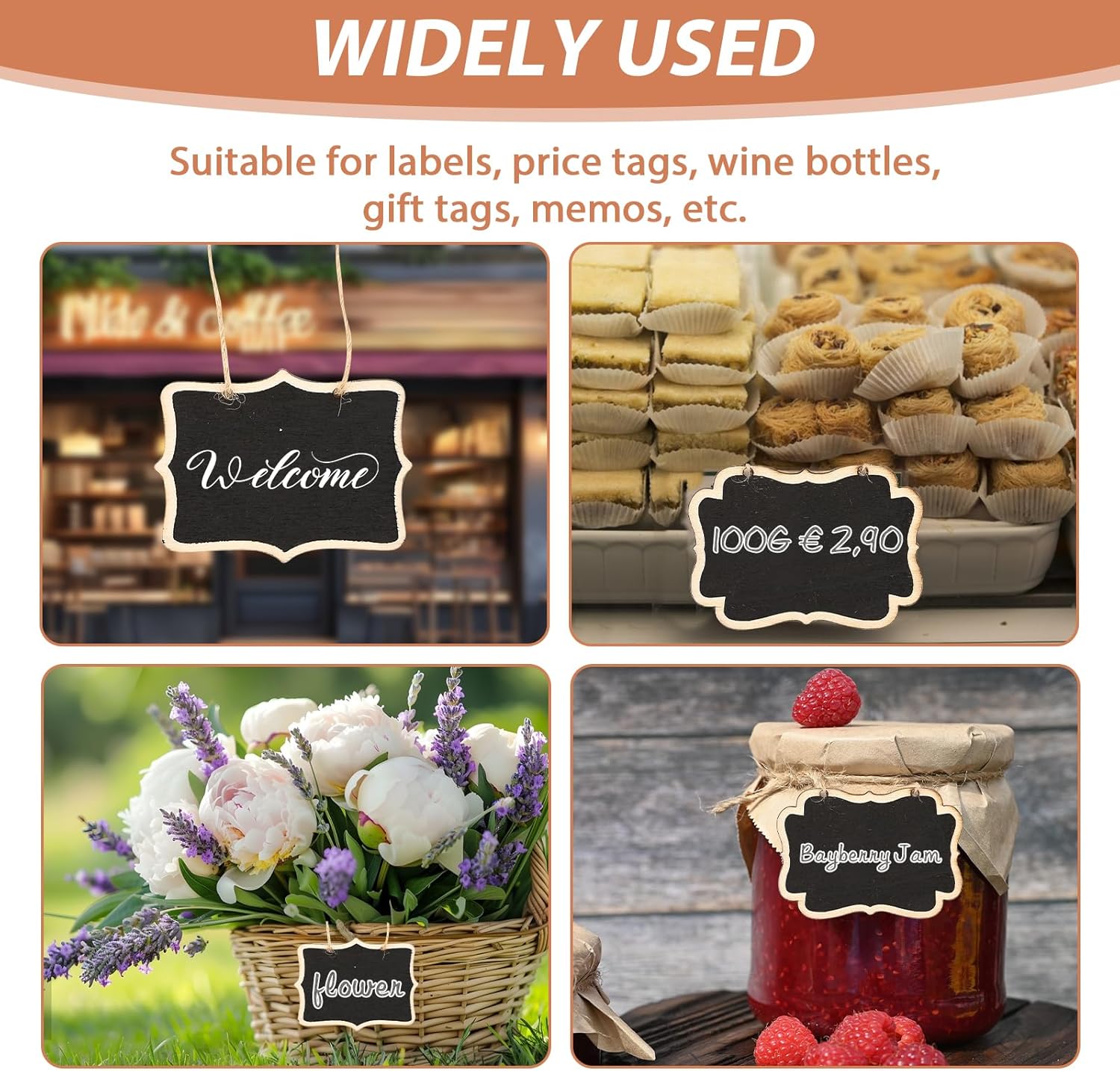 - 1. 24-Piece Mini Chalkboard Set with Versatile Styles:This set includes 24 premium mini chalkboard signs—12 lace-edged + 12 cornered—each with a hanging rope for easy display. Crafted for events, these chalkboard signs blend rustic charm with practical labeling, ideal for food labels for party buffet or drink stations. At 3.35"x 2.36", their compact size fits tables, shelves, or hanging setups, perfect for weddings, birthdays, or catered gatherings.