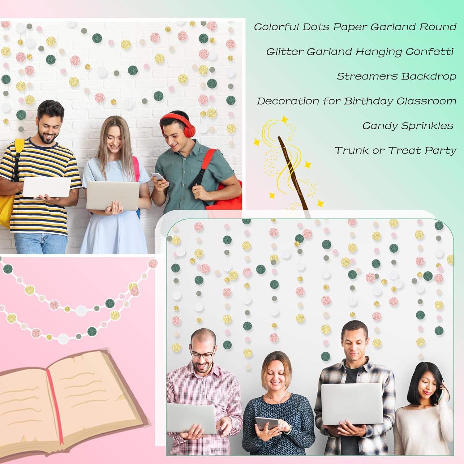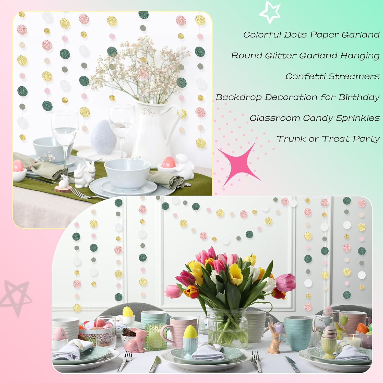 Outus 10 Pieces Colorful Dots Paper Garland Round Glitter Garland Hanging Confetti Streamers Backdrop for Candy Birthday Classroom Halloween Trunk or Treat Car Decoration (Sage Green,Pink,Gold)