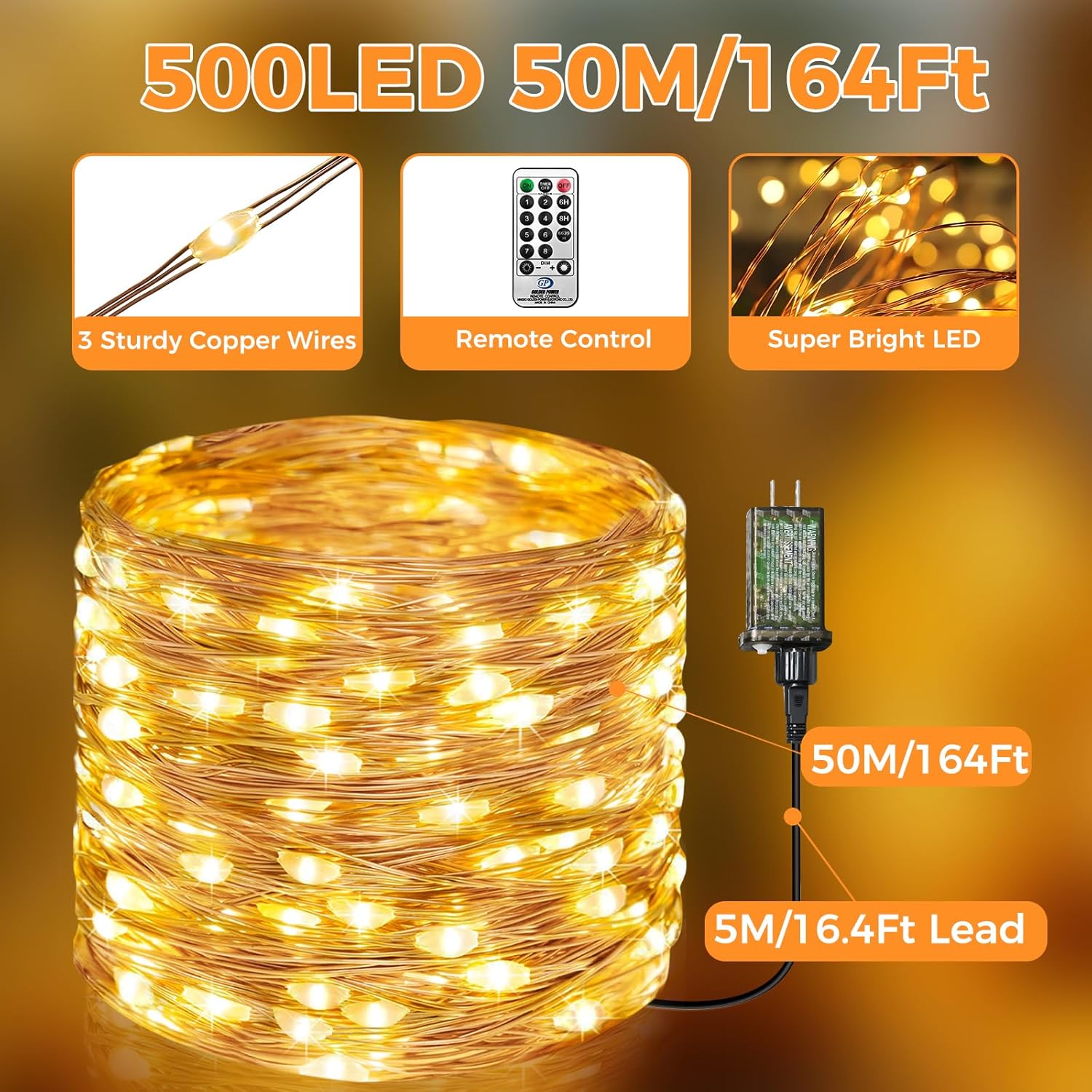 - 165FT+16FT String Lights: The 165FT fairy ligh is equipped with 500 high-brightness LEDs. To avoid being restricted by power outlets, it also features a 16FT lead length for convenient use, suitable for decorating bedrooms, living rooms, Christmas trees, Christmas wreaths, gardens and courtyards. Warm and bright light can illuminate every corner of your home, bringing hazy and dreamy lighting effects, creating a romantic and cozy atmosphere for your home