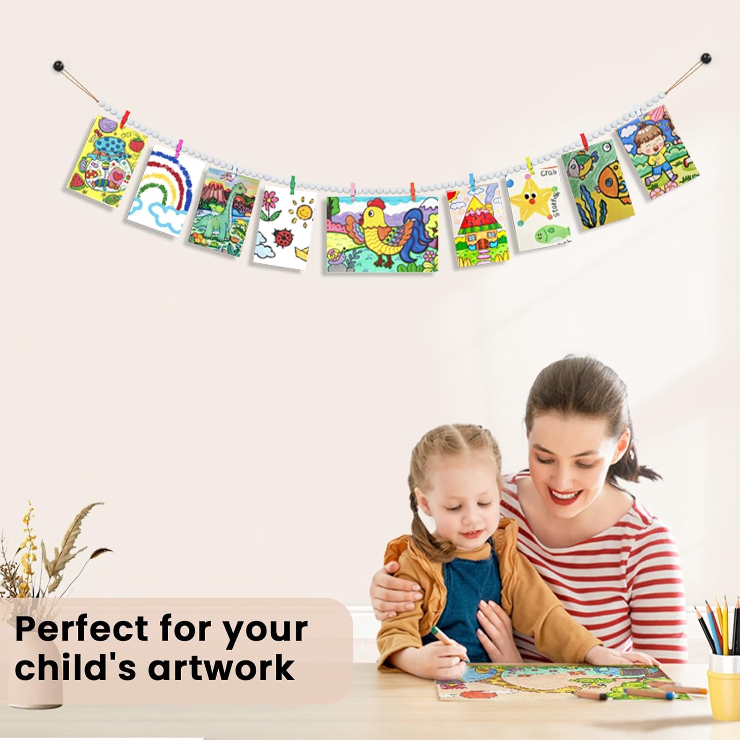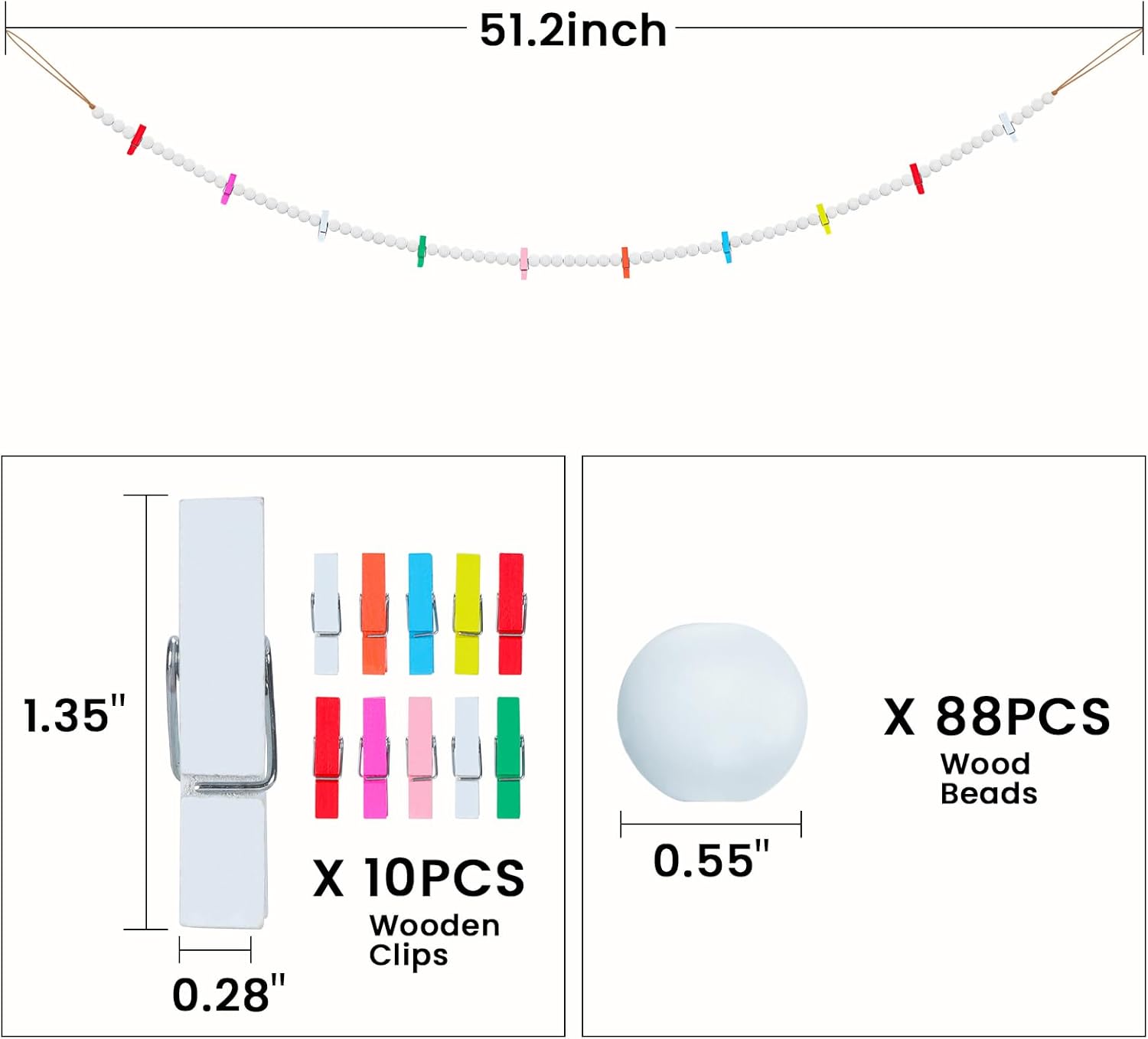 - This hanging photo display is hand-made with white wooden beads and cotton rope, durable, corrosion-resistant and non-toxic, not easy to break and fade. Note: The colours of the wooden clips are random