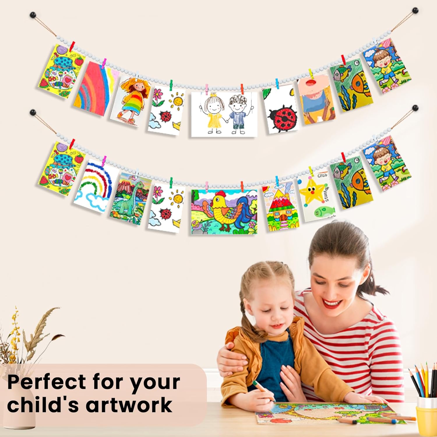 - This hanging photo display is hand-made with white wooden beads and cotton rope, durable, corrosion-resistant and non-toxic, not easy to break and fade. Note: The colours of the wooden clips are random