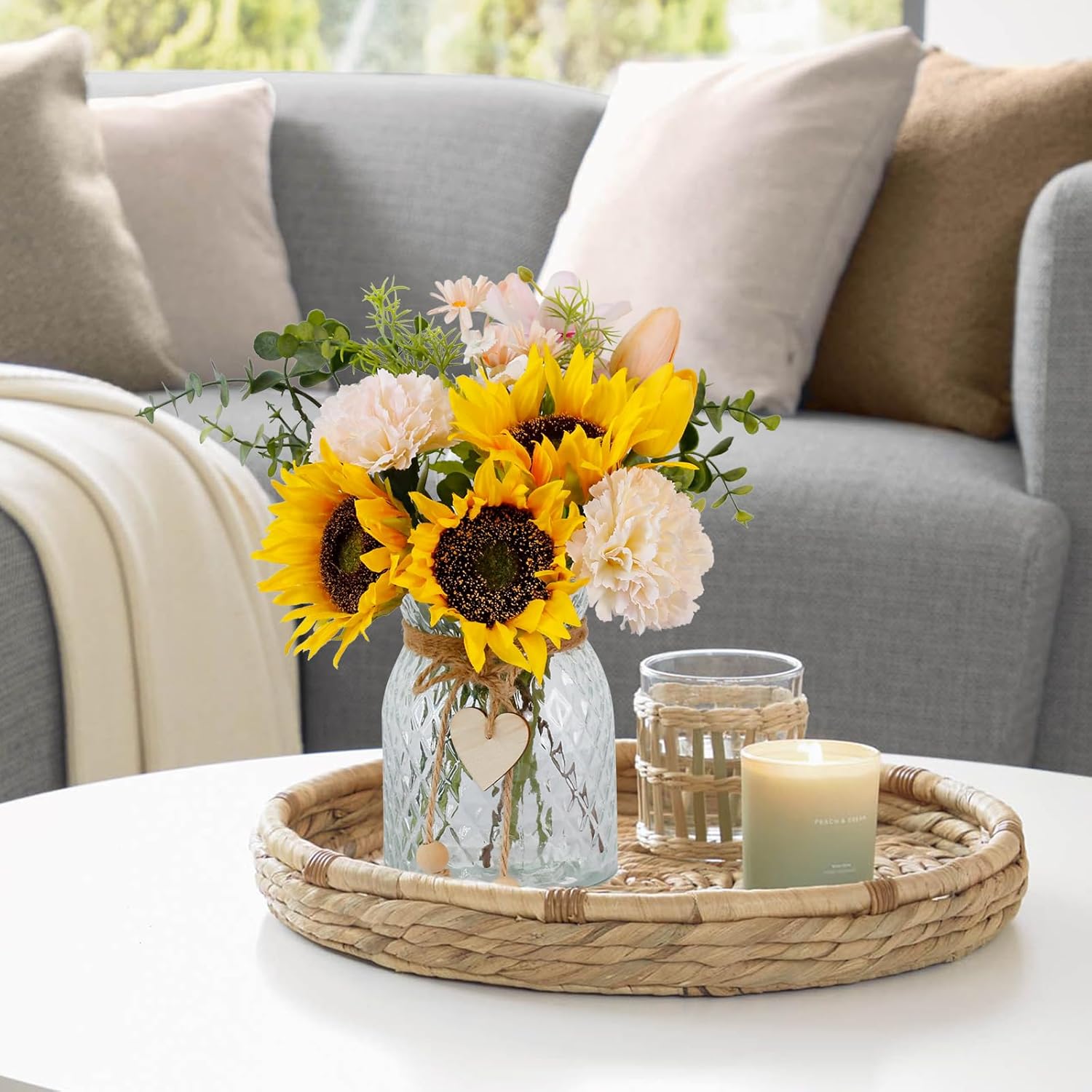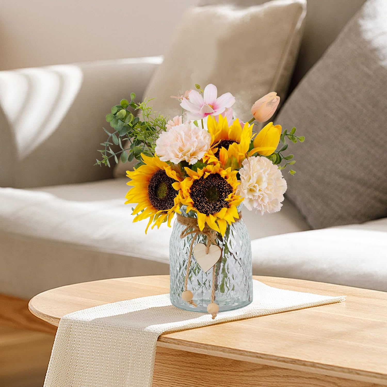 - LEFTOVER's Fake Flowers in Vase:Artificial silk sunflowers Bouquet in Vase includes 3 sunflowers ,2 carnations and 2 tulip, as well as some plants and small flowers,and a glass vase with a heart,ball pendant,twine and flower arrangement holder.Perfect for coffee table centerpiece and dining table centerpiece decor