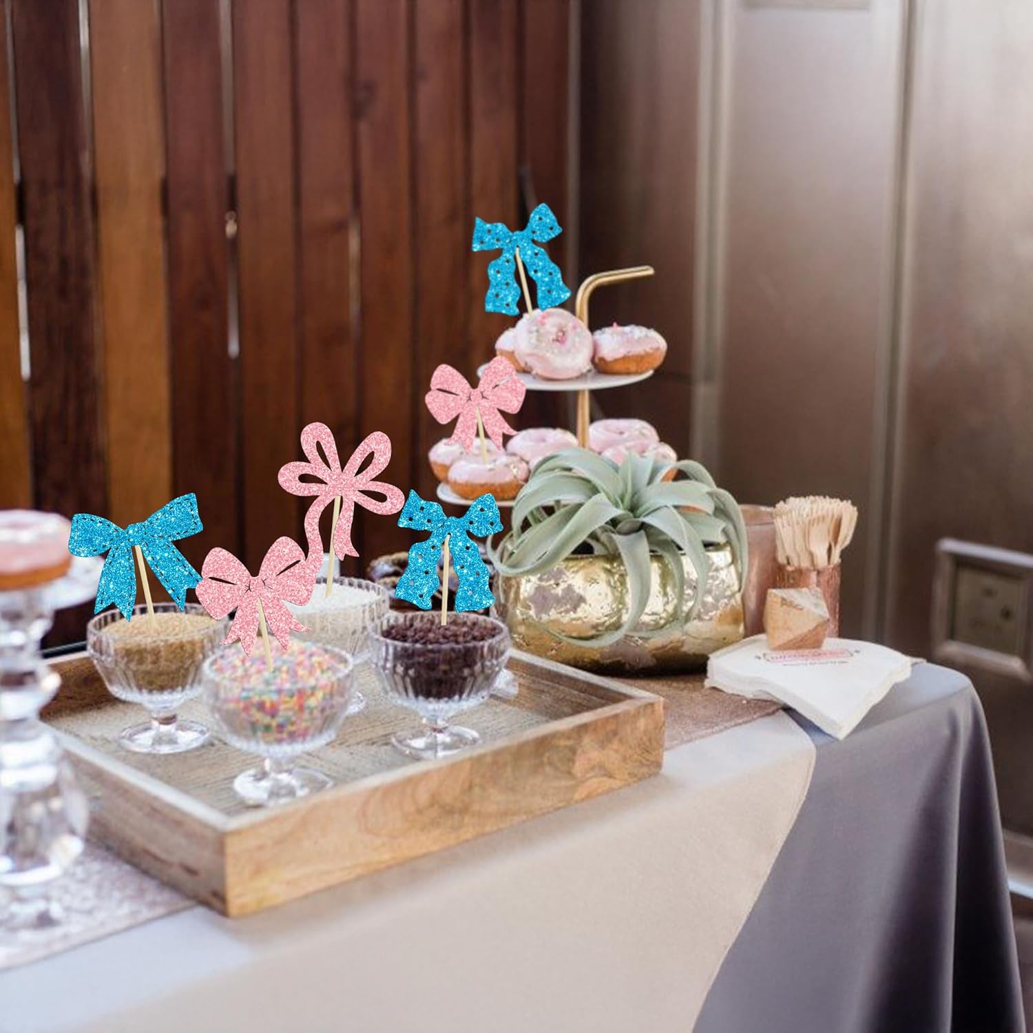 Ephlyn 24Pcs Pink Bow Cupcake Toppers Bow Birthday Cake Topper Girls Birthday Party Decorations Bowknot Cupcake Decorations for Bridal Baby Shower Birthday Wedding Themed Party Pink Blue