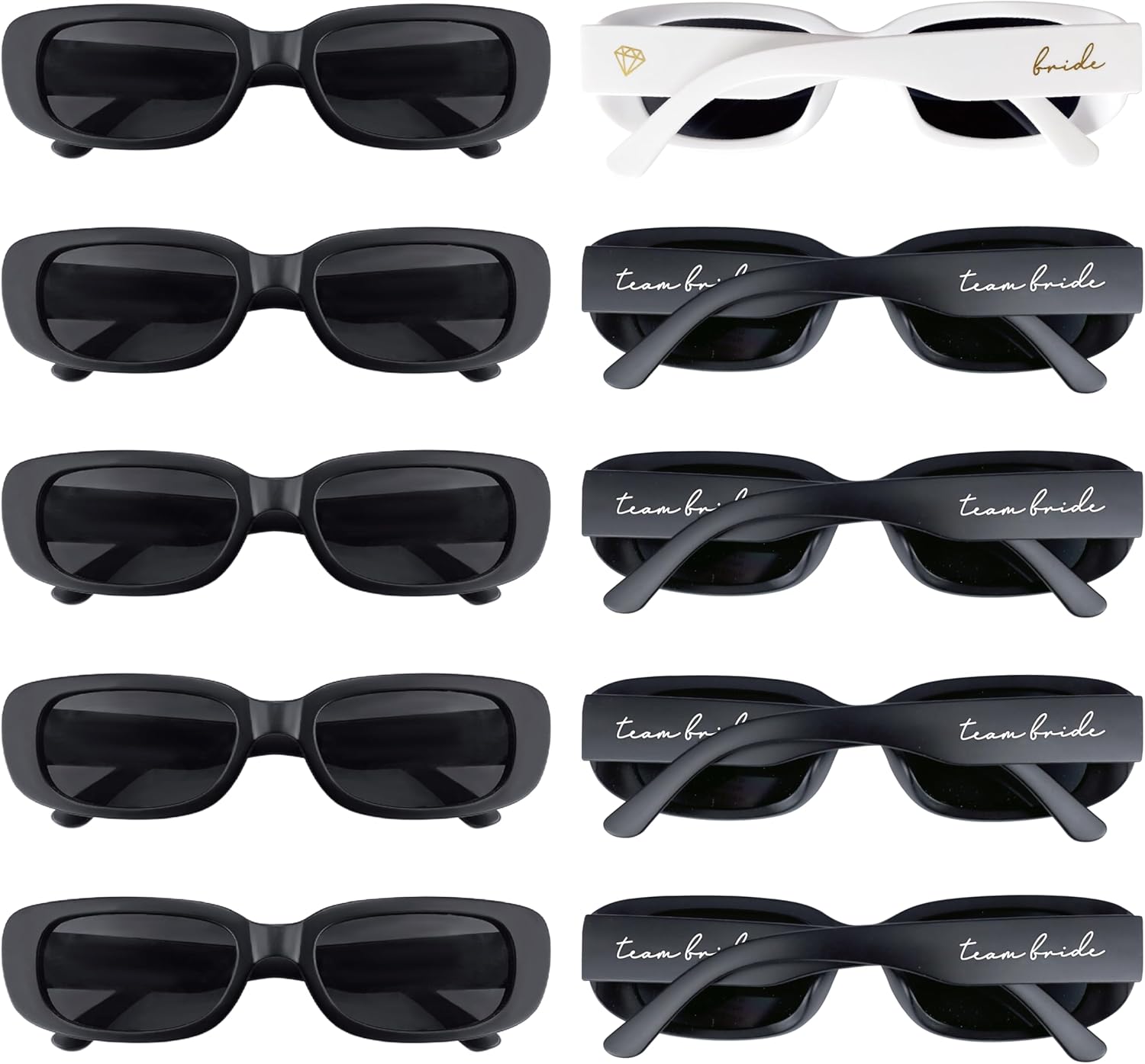 - 【Bachelorette Sunglasses Set】 One white pair of "Bride" sunglasses for bride to be and nine black "Team Bride" sunglasses for bridesmaid. Plastic frames and lenses have scratch resistant coating - surprisingly durable for the price