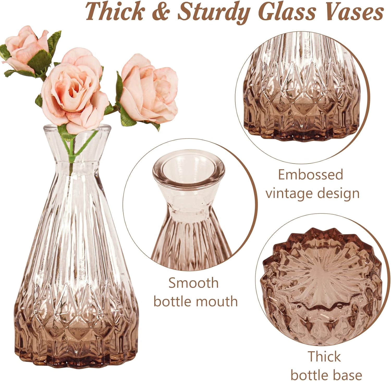 - Thick and Sturdy Glass: These charming small flower vases are made of thick and strong glass, which are sturdy and not easy to break. You can trust that these vases will last for years to come, allowing you to reuse them for future events. The delicate and lustrous texture and crystal amber color makes them shine in the light. Just insert some flower branches and green leaves to get a picturesque view, perfect for decorating your living room kitchen bedroom.