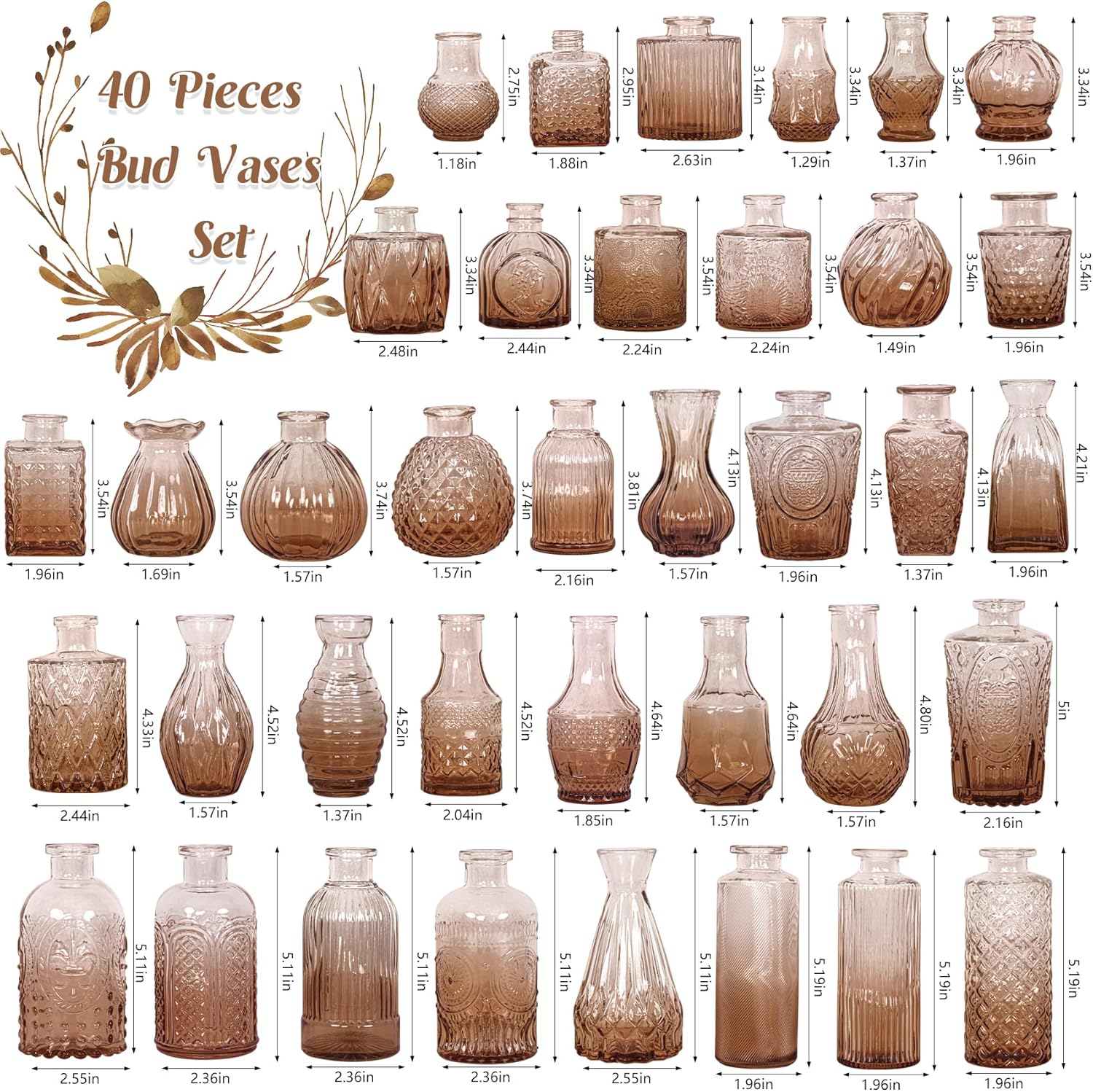 Set of 40 Glass Bud Vases, Small Amber Glass Vases in Bulk, Mini Vintage Embossed Flower Vase for Wedding, Centerpieces, Birthday Party, Baby Shower, Home Table Decorations (Amber)
