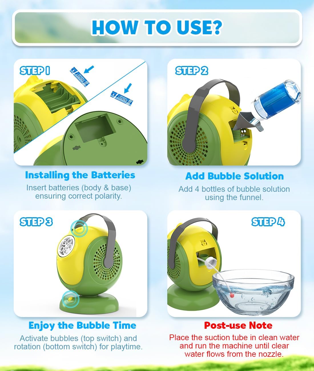 - WHAT IN BOX: The set includes 1 bubble machine, 4 bottles of bubble solution *50ml, 6*AA batteries and 1 funnel(for solution).