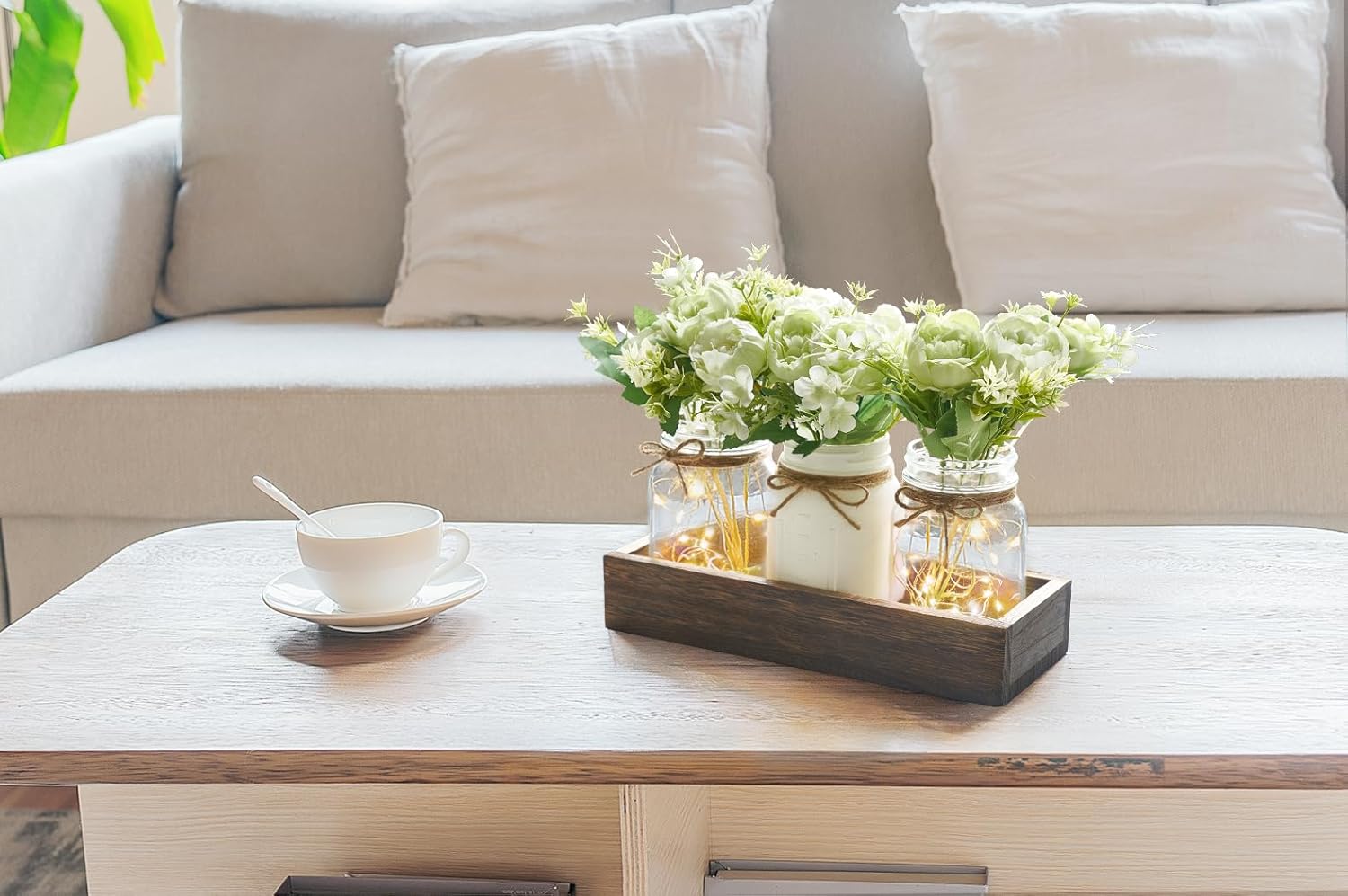 Mkono Mason Jar Lights Centerpiece Table Decorations for Dining Room Farmhouse Coffee Table Decor Wood Tray with 3 Jars Flowers for Kitchen Living Dining Room (Light Green)