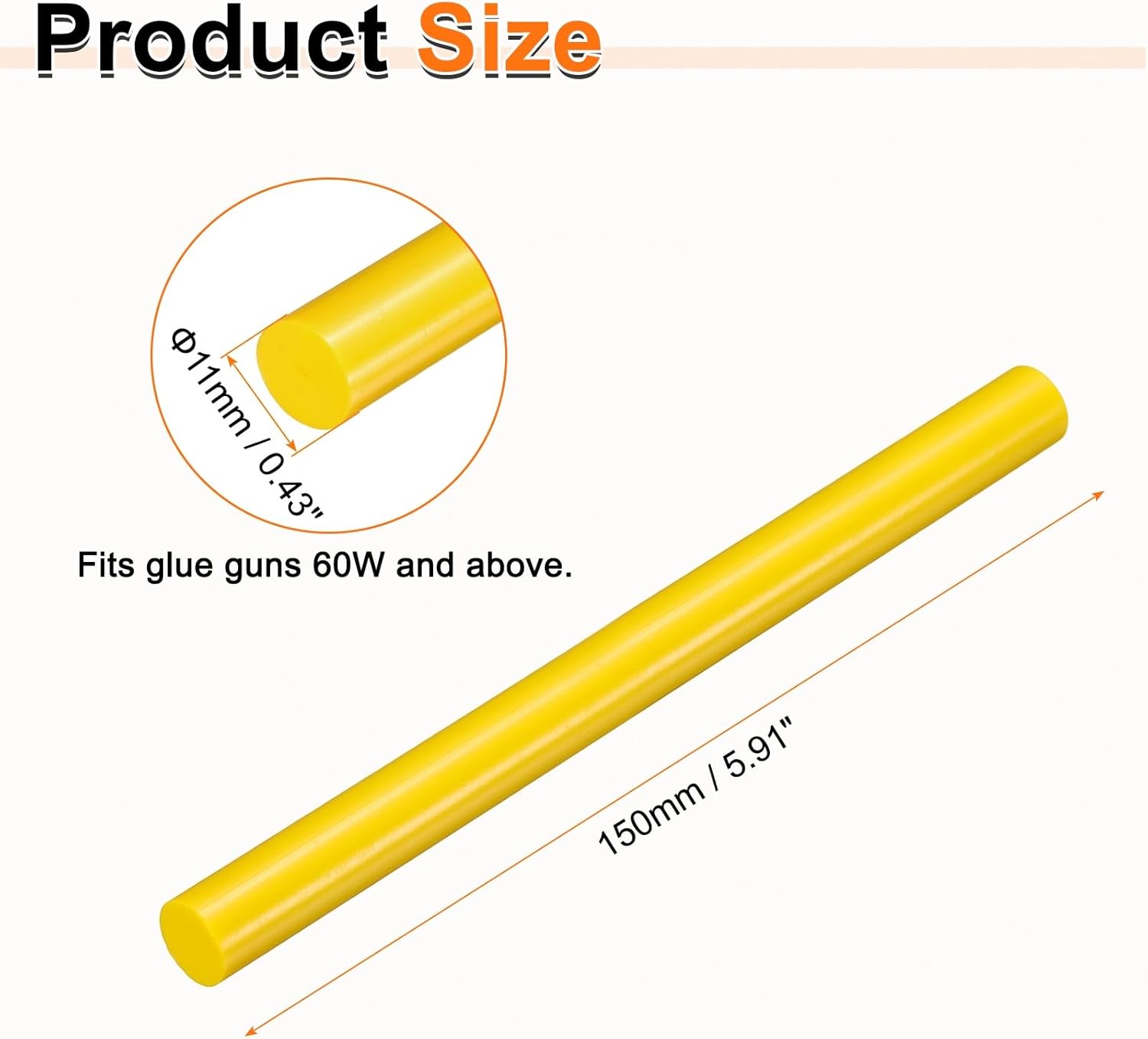 - Size - Hot glue sticks size: 11 x 150mm / 0.43 x 5.91 inch (D*L); Curing time: 10–15 seconds; Working temperature: 150°C (302°F); Softening point: 75°C (167°F).