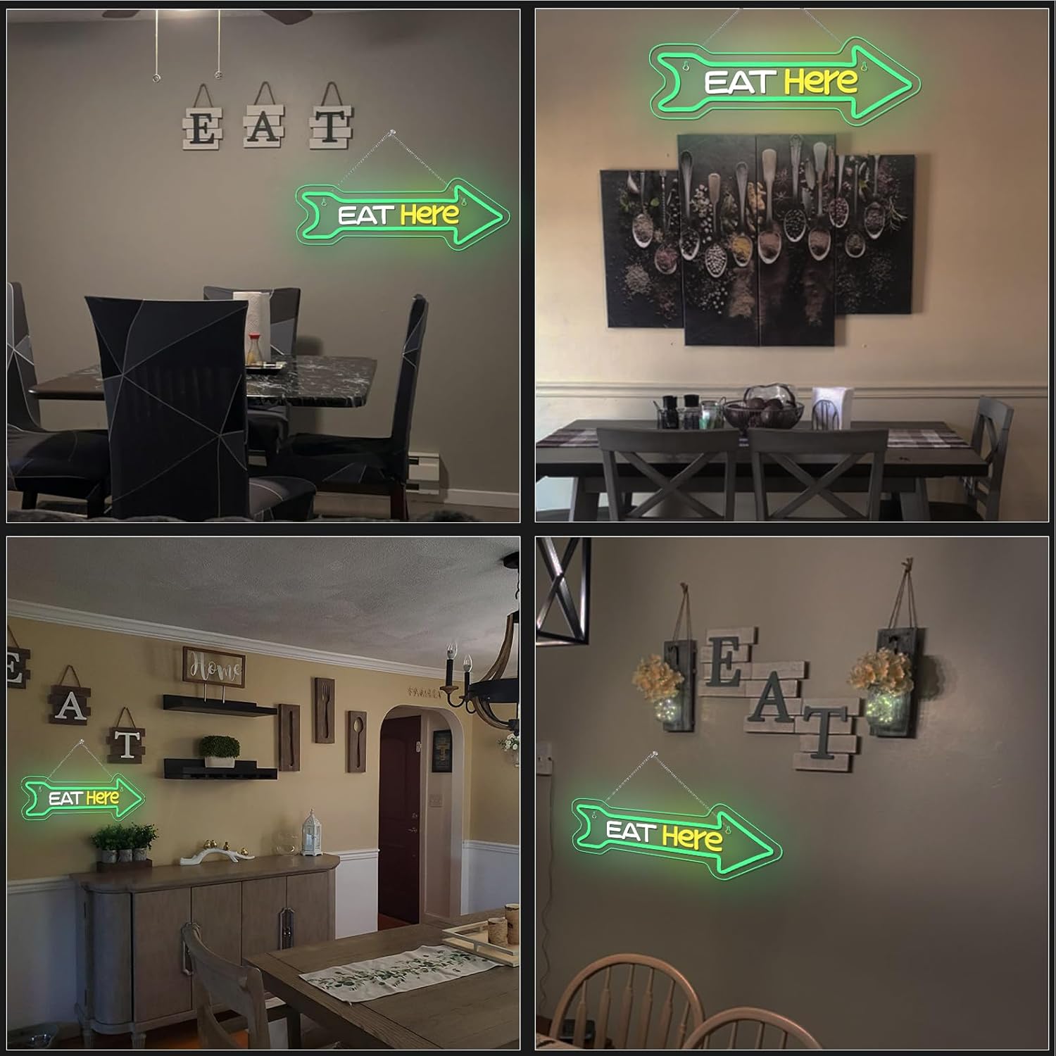 - UNIQUE DESIGN:Neon lights are designed with the perfect combination of arrows and text eat here, bold and charming, easily becoming the visual focus in the space
