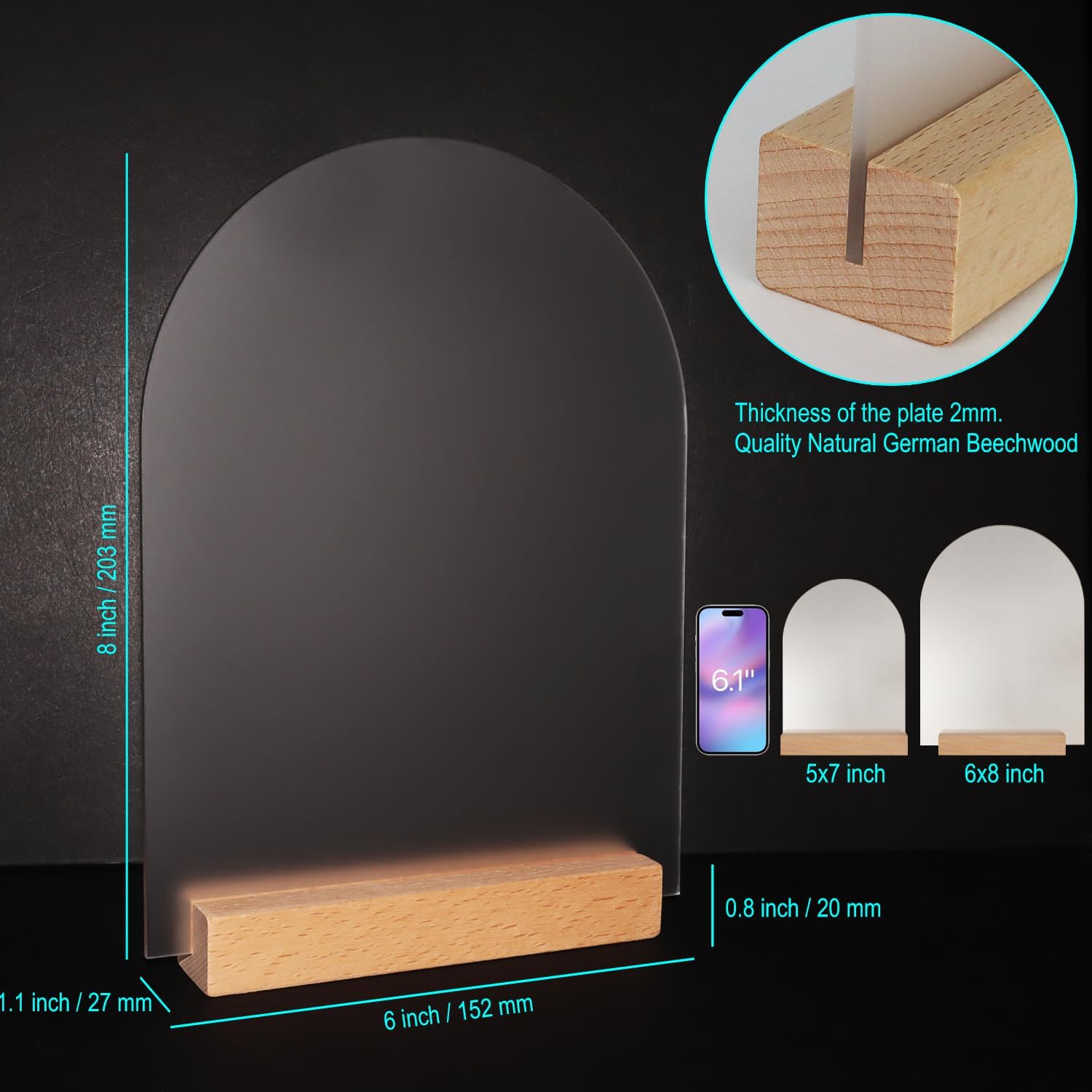 - PERFECT MATCH - This set includes 10 frosted arch-shaped blank acrylic pieces and 10 wooden sign stands for creating your own DIY wedding signs. Each blank acrylic piece measures 152x203x2mm / 6x8 inches, 1/8 inch thick,and each wood stand measures 127x28x20 mm / 5x1.1x0.8 inches. All acrylic pieces come with protective film on both sides to prevent scratches; simply peel off the film when ready to personalize.