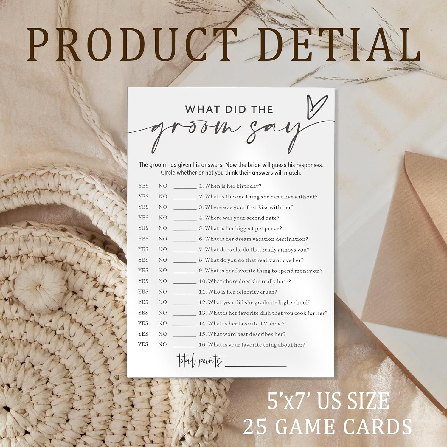 Fun Wedding Shower Games Cards, What Did the Groom Say, Bridal Shower Games for 25 Guests, Engagement Party Wedding Game Cards (5 × 7 Inch), Minimalist White Newlywed Party Gift & Supplies - A12