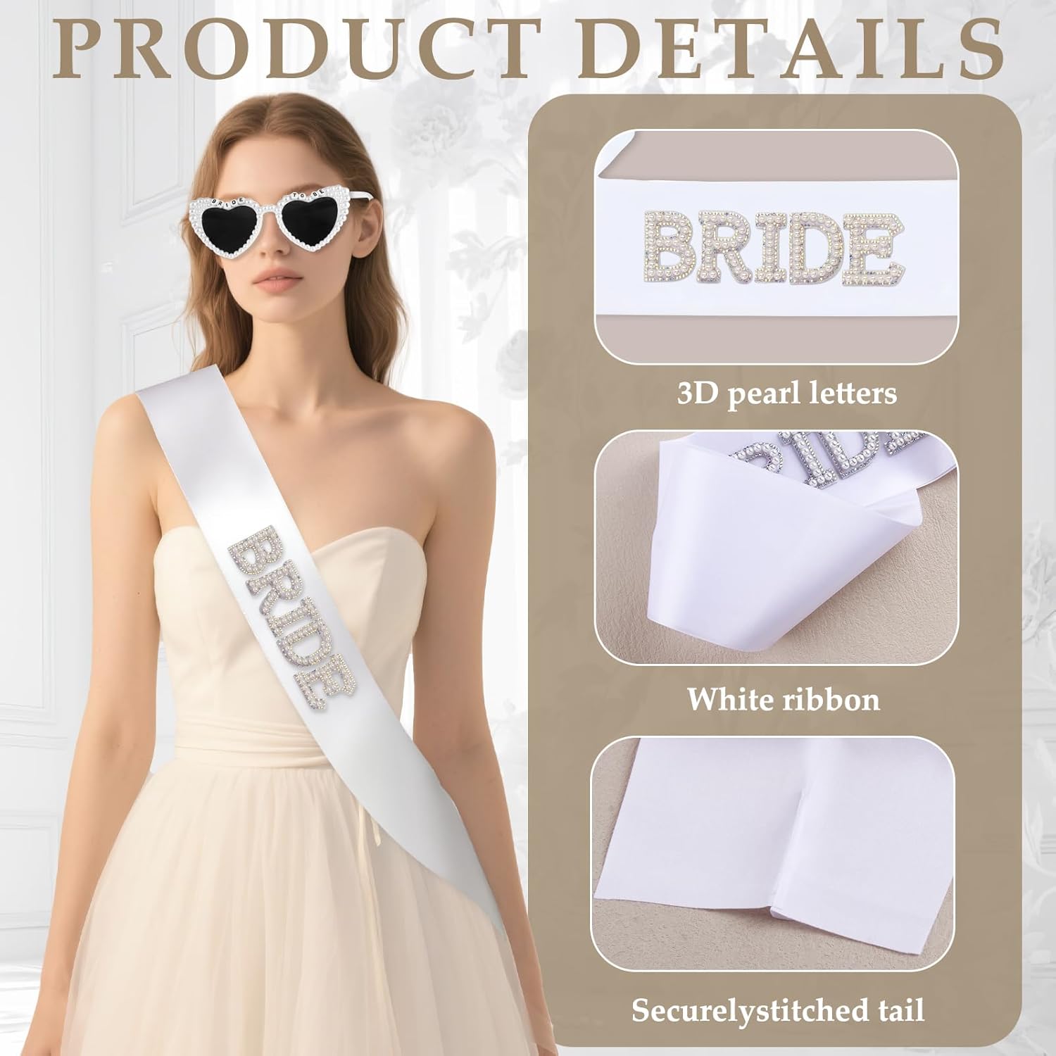 3Pcs Bride to Be Sash and Bow Veil Set, Bachelorette Party Favors, White Pearl Bride To Be Sash, Pearl Heart Sunglasses for Bachelorette Party Gifts Bridal Shower Wedding