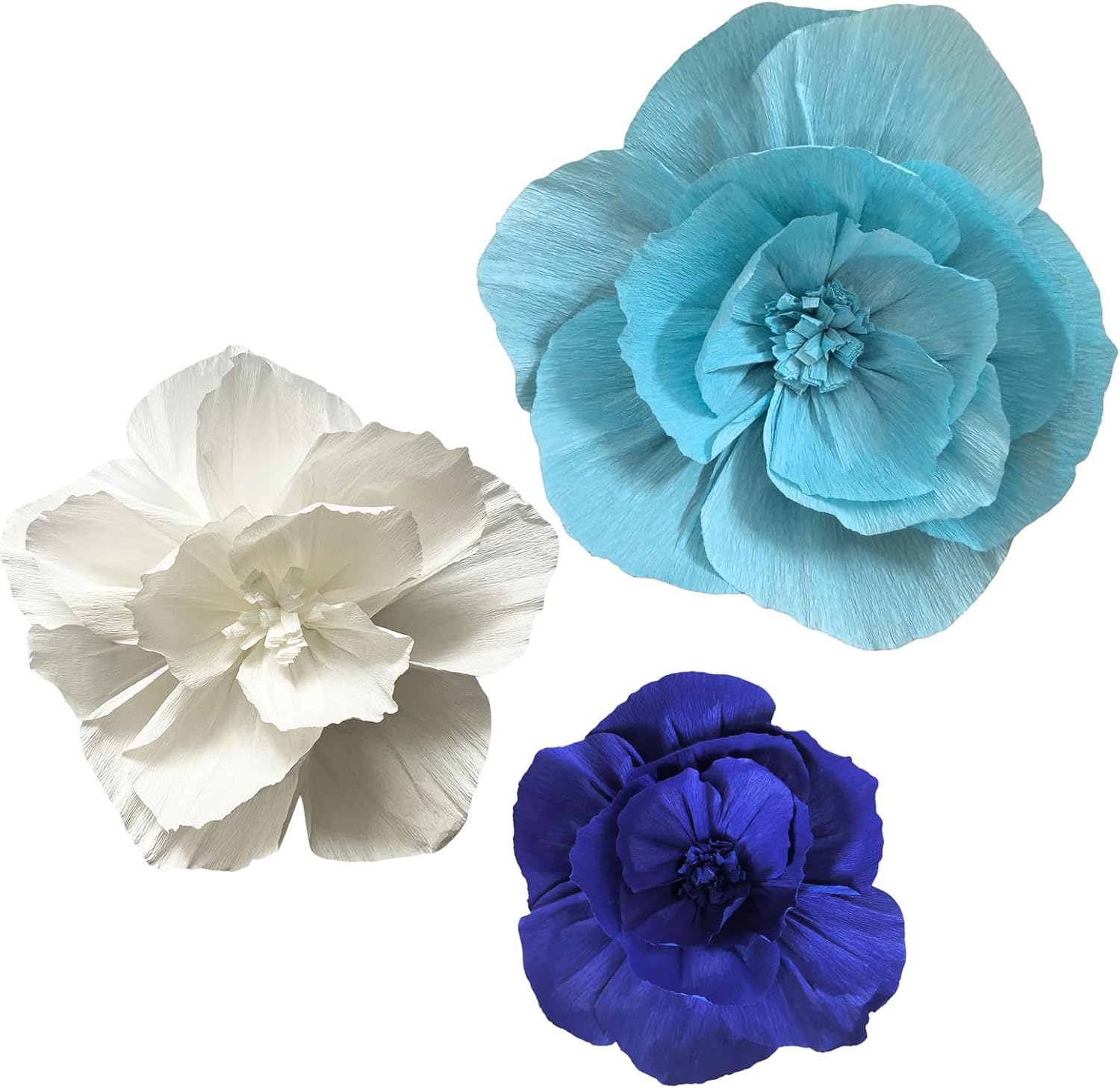 - Crepe Paper Flowers: Total 9pcs navy blue light blue white paper flowers in 3 sizes 12”, 10”, 8”.