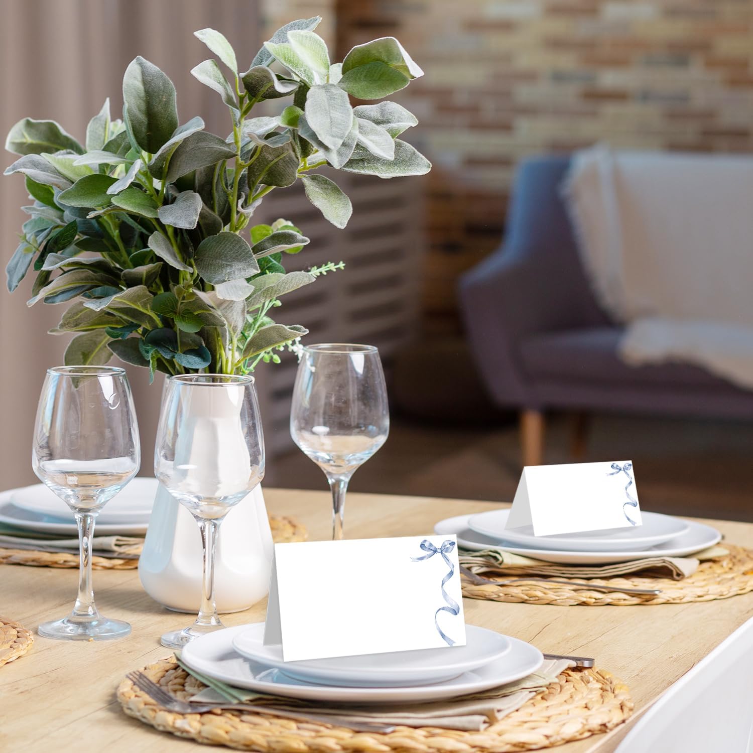 25 Pack Blue Bow Place Cards, Editable Name Cards for Table Setting, Tent Cards Food Label for Dinner Party, Bridal Shower, Wedding, Baby Shower and Events -T27