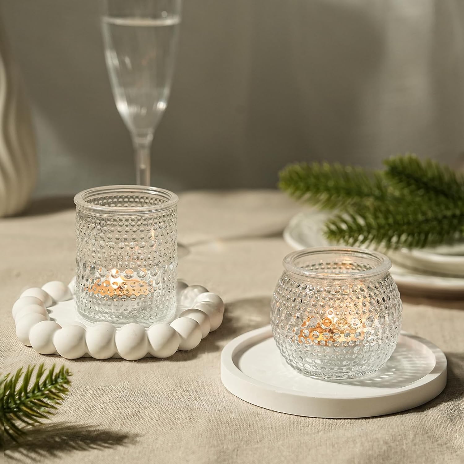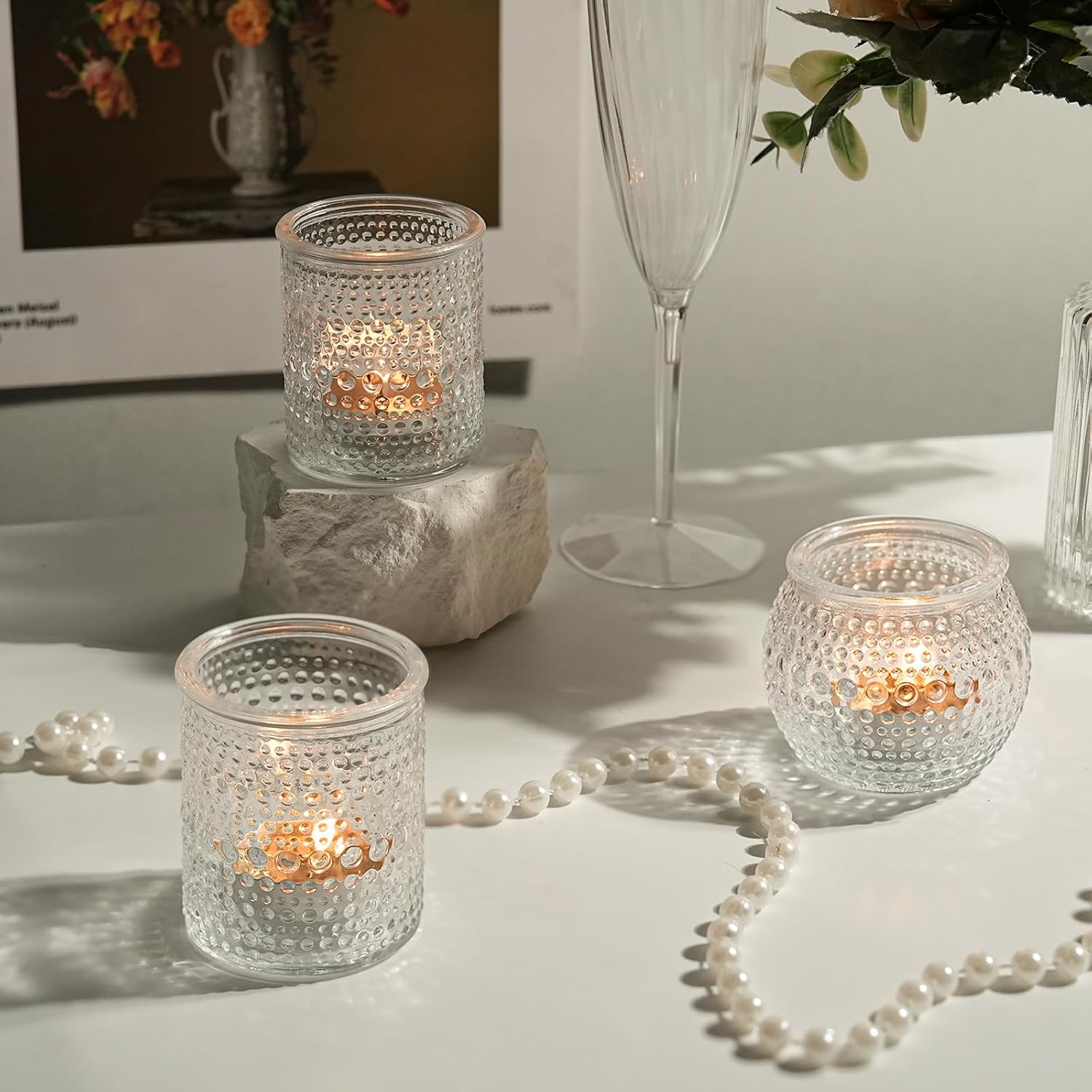 - Dazzling Dot Tea Lights Candle Holder: Each tea lights candle holder features delicate dot embellishments that catch and refract light, casting mesmerizing patterns when lit. The transparent glass enhances this effect, turning ordinary candles into a stunning light display