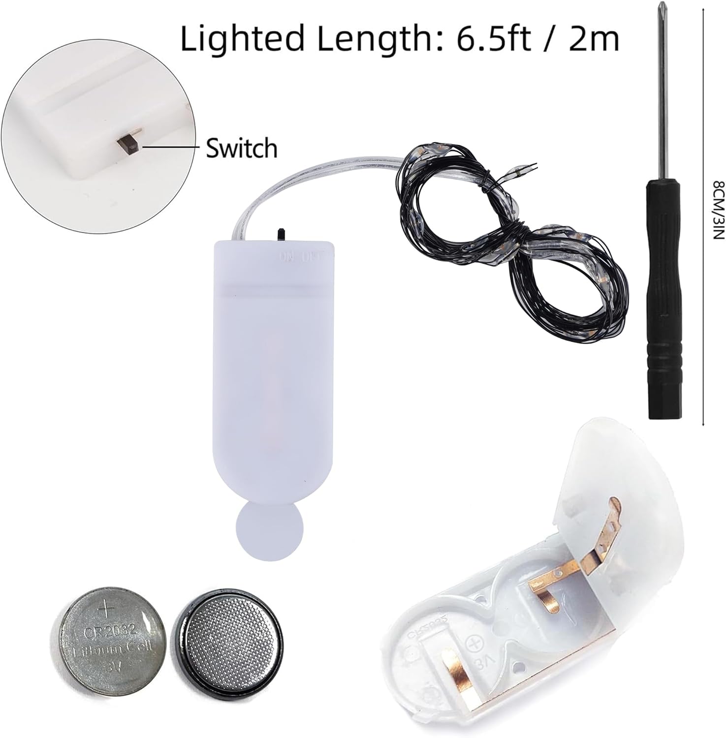 - What You Get: 12 x fairy Lights, 1 x screwdriver, each string lights include 2 button batteries. Each item length- 2m/6.5feet, LED quantity- 20 LEDs/per lights, distance between LED- 10cm/4 inches. The size of battery case is only 0.9 x 2 inches, which makes it very easy to hide, great for decorating your Halloween table decor, Mason Jar and other things
