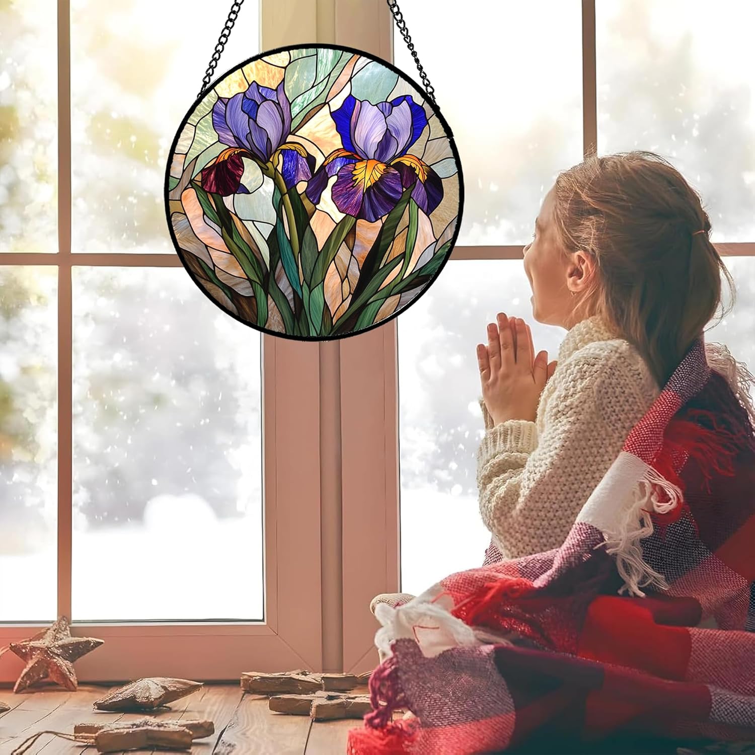 Stained Glass Window Hanging, Purple Blue Iris Birth Flower Suncatcher for Doors Garden Yard Sun Catchers Decor Christmas Mother's Day Birthday Gifts for Teacher Women Mom Nana Wife 7.8 in