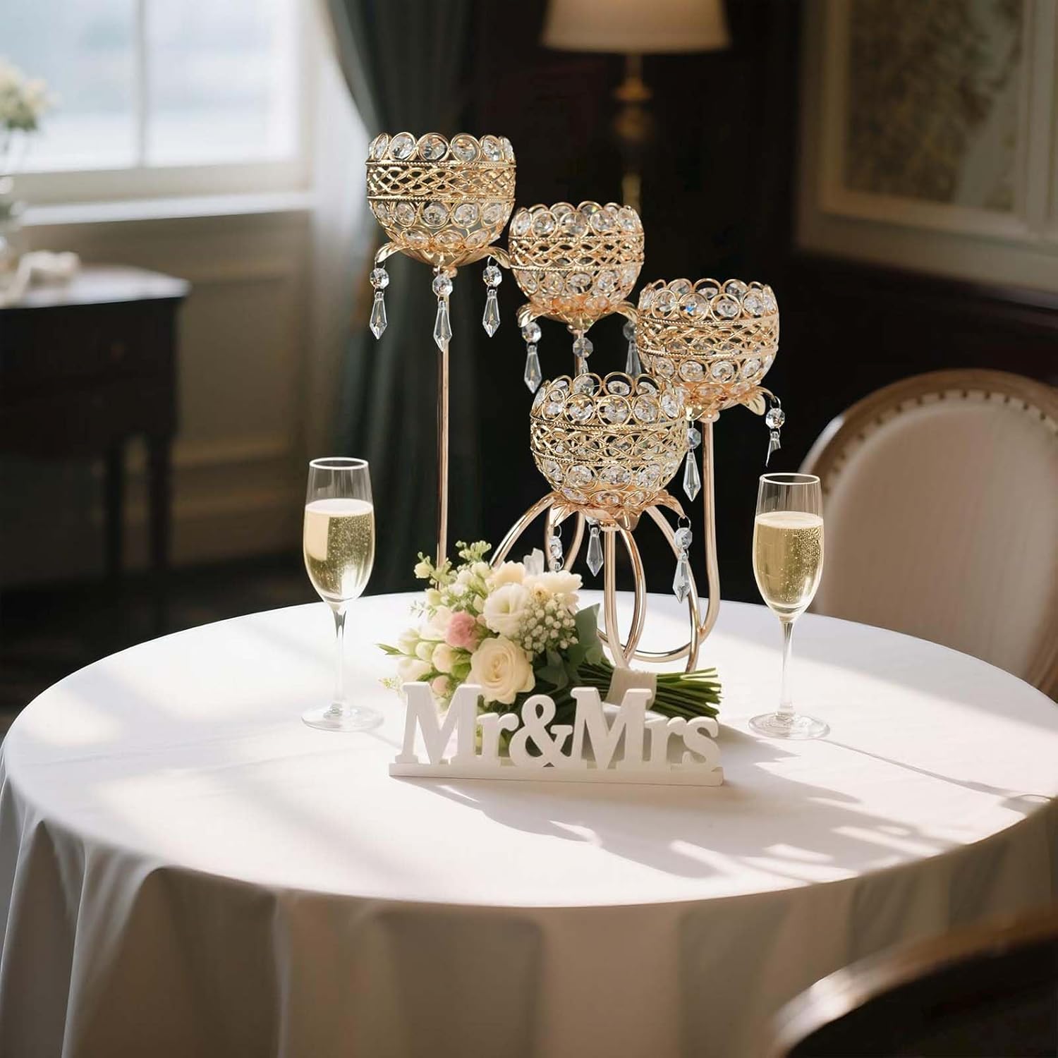 4 Arms Crystal Candelabra Tealight Holder - Tall 15.7 Inch Elegant Centerpiece with Crystal Pendant Bowls & Artistic Metal Stand for Wedding, Dining Table, Home Decor (2, Gold)