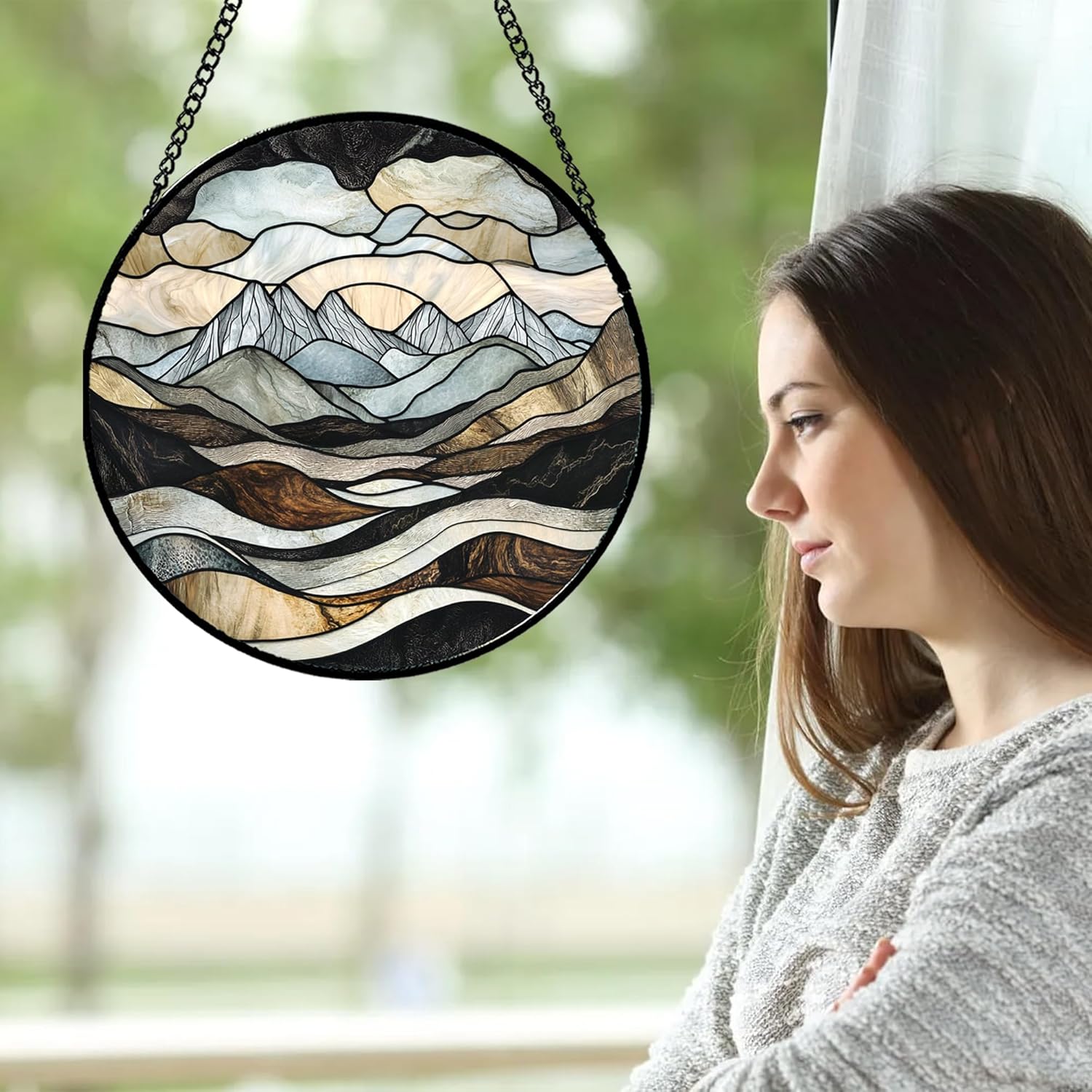 Stained Glass Window Hanging - Grey Mountains Landscape Suncatcher for Doors Garden Patio Retro Sun Catchers Decor Christmas Mother's Day Birthday Gifts for Women Men Mom Nana Friend 15 in